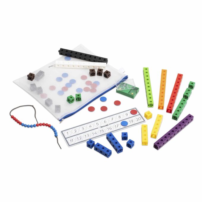 - 100 bunte Steckwürfel mit einer Kantenlänge von 2 cm. Diese Würfel ermöglichen es, lineare Konzepte anschaulich darzustellen und helfen beim Vergleichen, Sortieren und Abgleichen von Mengen.