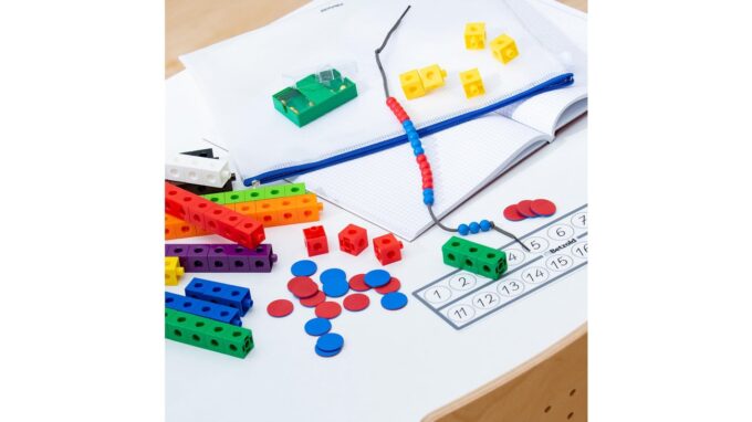 - 100 bunte Steckwürfel mit einer Kantenlänge von 2 cm. Diese Würfel ermöglichen es, lineare Konzepte anschaulich darzustellen und helfen beim Vergleichen, Sortieren und Abgleichen von Mengen.