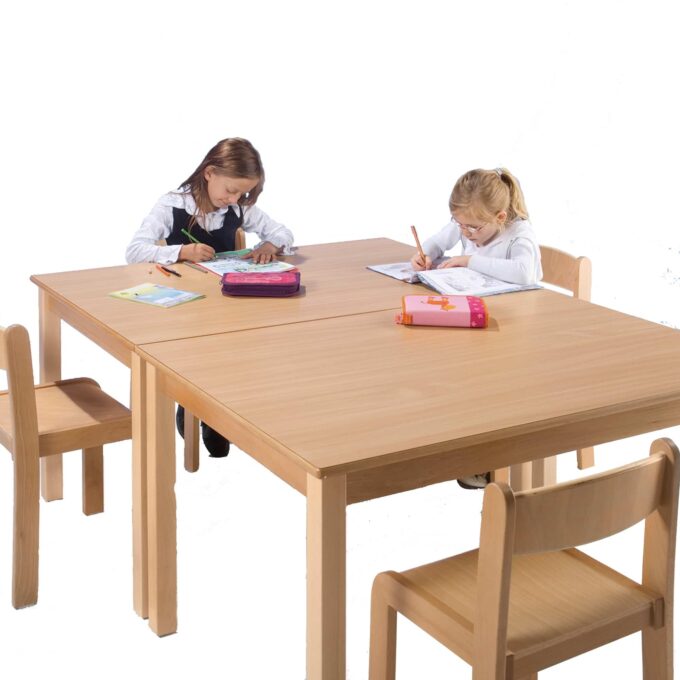 Die herausragende Qualität der beschichteten Tischplatte, abgerundet durch die massiven Bucheneinleimer, ist kinderfreundlich, leicht zu reinigen und widersteht den alltäglichen Belastungen mit Leichtigkeit. Ob beim Basteln, Malen oder Lernen – diese Tische sind so multifunktional, dass sie alle Aktivitäten unterstützen.