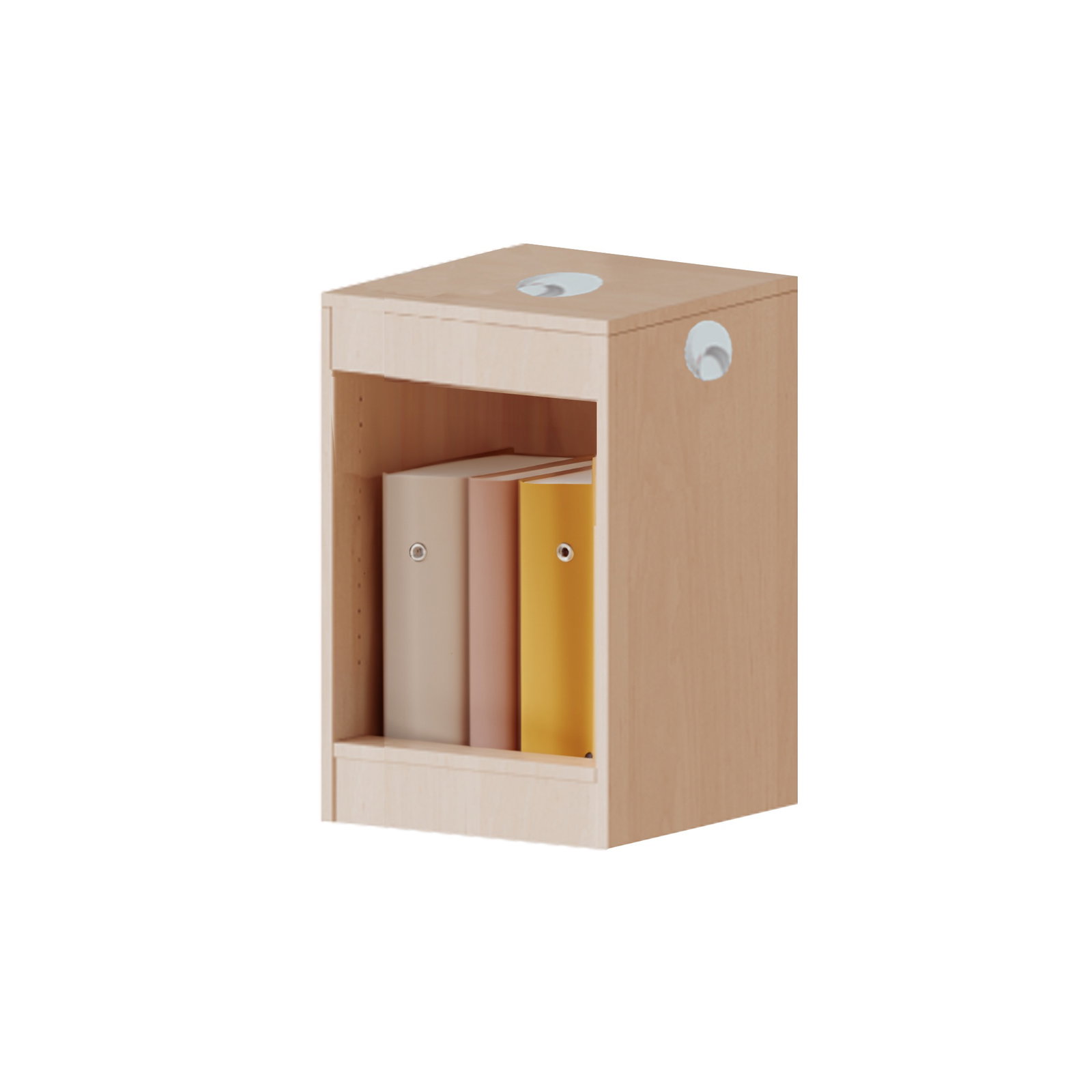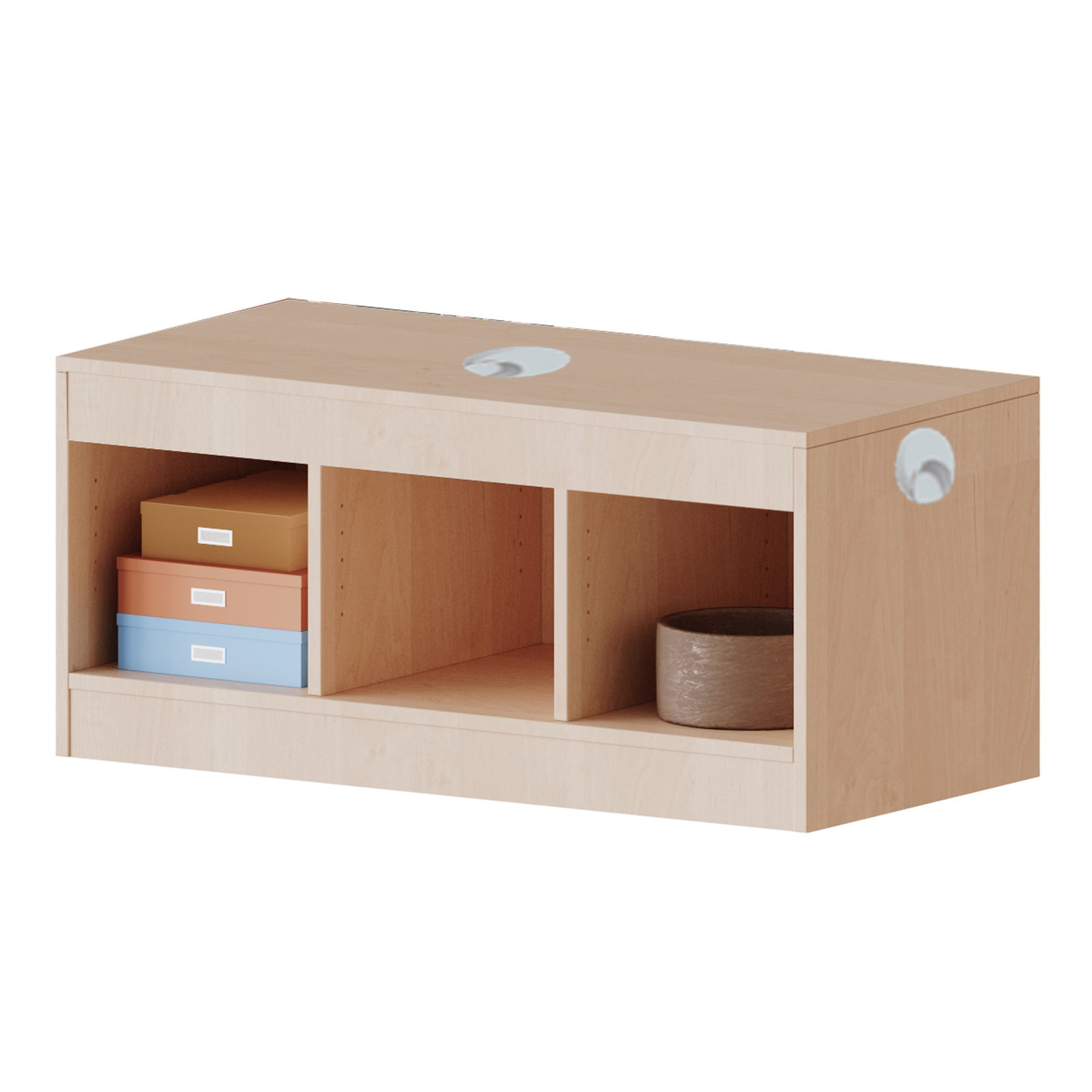 Das smarte Herzstück dieses Regals ist das standardmäßig verbaute Kabelfach. Mit einer Höhe von etwa acht Zentimetern direkt unter dem Oberboden bietet es Ihnen ausreichend Platz, um Kabelstränge oder kleine technische Geräte unsichtbar zu verstauen. Drei geschickt platzierte Kabeldurchlässe – mittig im Oberboden sowie im oberen Bereich der Seitenwände – ermöglichen eine völlig flexible und unkomplizierte Stromversorgung Ihrer Arbeitsgeräte. Unterhalb des Kabelkanals steht Ihnen ein geräumiges Fach zur Verfügung. Dessen Höhe ist exakt auf die Maße von Standard-Aktenordnern abgestimmt. So bewahren Sie Ihre wichtigsten Dokumente, Lehrmaterialien oder Aufbewahrungsboxen stets griffbereit und übersichtlich sortiert auf.