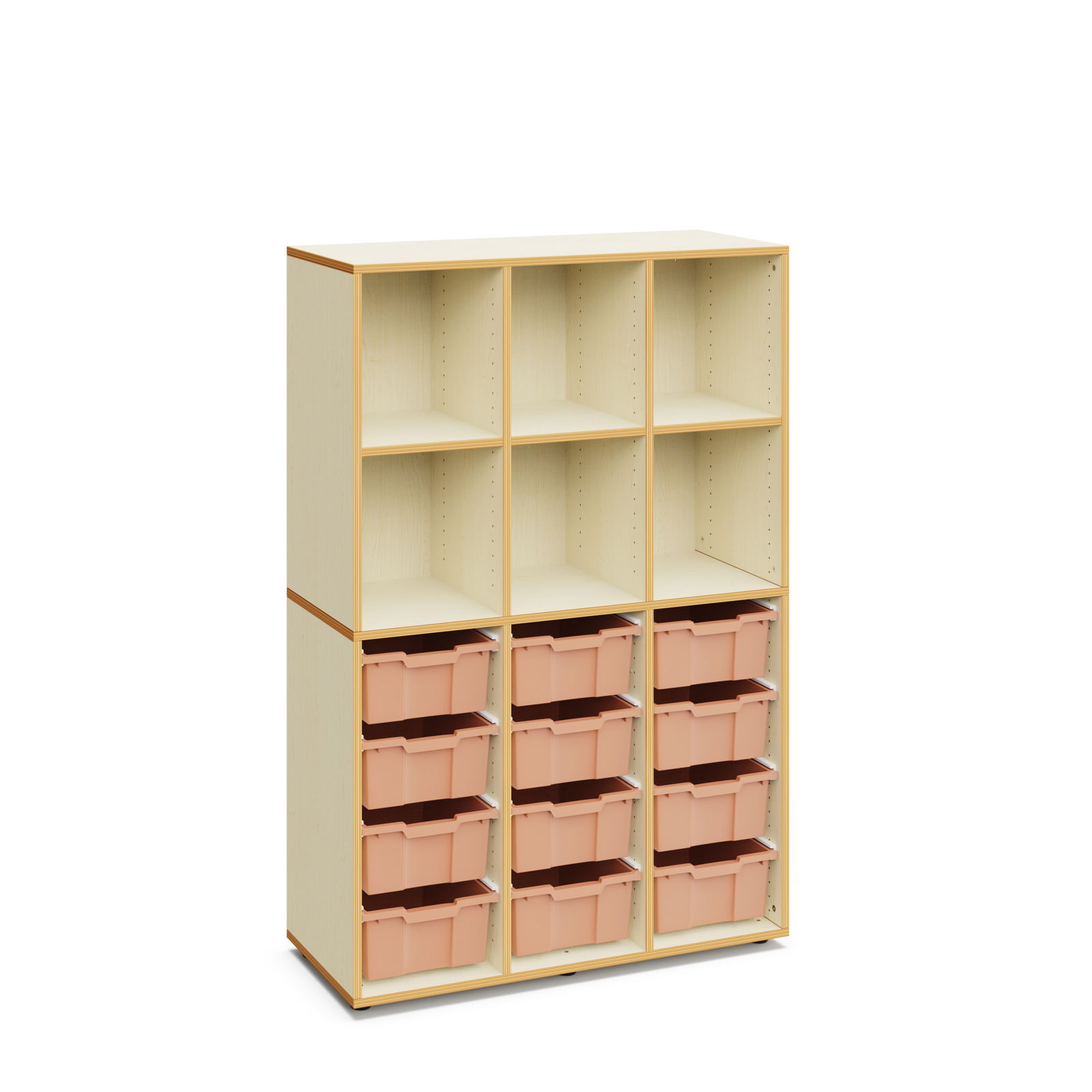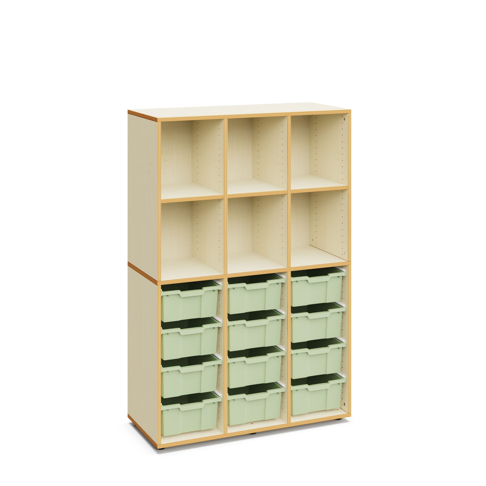 Das Herzstück dieses Möbelstücks bilden die zwölf hohen Kunststoffboxen. Mit den Maßen 42,5 x 15 x 31 Zentimetern fassen sie auch voluminösere Bastelutensilien, Spielzeuge oder Arbeitshefte mühelos. Zusätzlich stehen Ihnen sechs großzügige offene Fächer zur Verfügung. Diese eignen sich hervorragend für die Unterbringung von Büchern, Aktenordnern oder Gegenständen, auf die Sie und die Kinder einen besonders schnellen Zugriff benötigen.