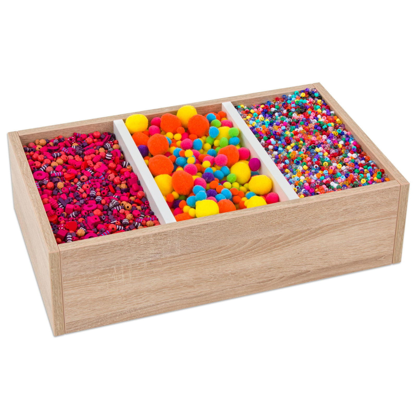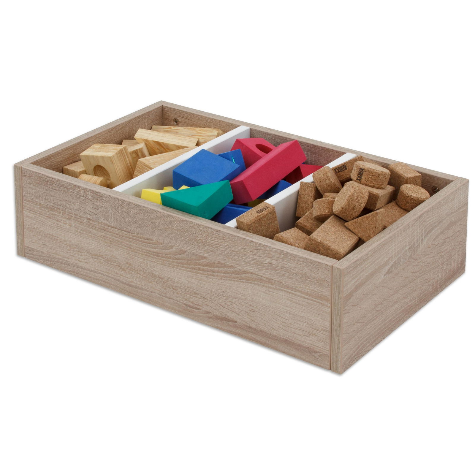 - Kategorisieren lernen: Die drei separaten Fächer laden Kinder ganz natürlich dazu ein, Gegenstände zu sortieren. Ob Legosteine, Holztierchen oder Malstifte – das Trennen und Gruppieren fördert das logische Denken und die visuelle Wahrnehmung.