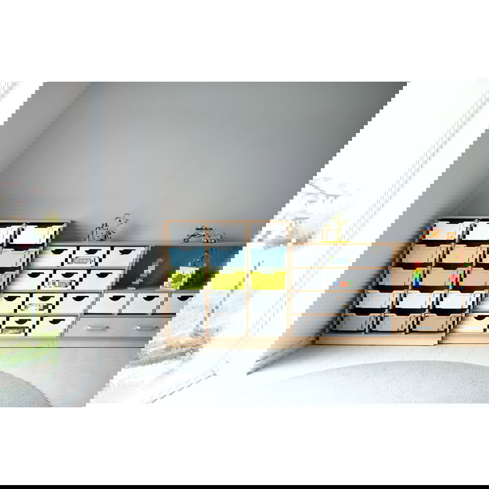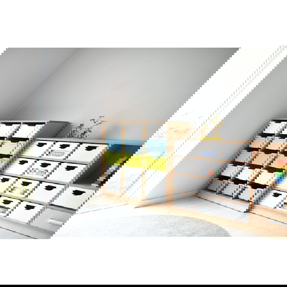 Das Besondere an diesem Set ist die bunte Vielfalt der 15 mittelgroßen Kunststoffbehälter (Größe 2). Sie erhalten jeweils drei Behälter in den Farben Weiß, Hellblau, Hellgrau, Silberfarben und Hellgrün. Diese bunte Mischung ist nicht nur ein fröhlicher Hingucker, der die Kreativität anregt, sondern auch ein unschlagbares Werkzeug zur Organisation. Weisen Sie jeder Farbe ein bestimmtes Thema, eine Gruppe oder eine Materialart zu. So lernen Kinder spielerisch, Ordnung zu halten. Die voluminösen Behälter sind ideal für Bausteine, Kostüme oder größere Bastelprojekte. Dank der hochwertigen Sichtrückwand kann das Regal zudem als attraktiver Raumteiler genutzt werden.