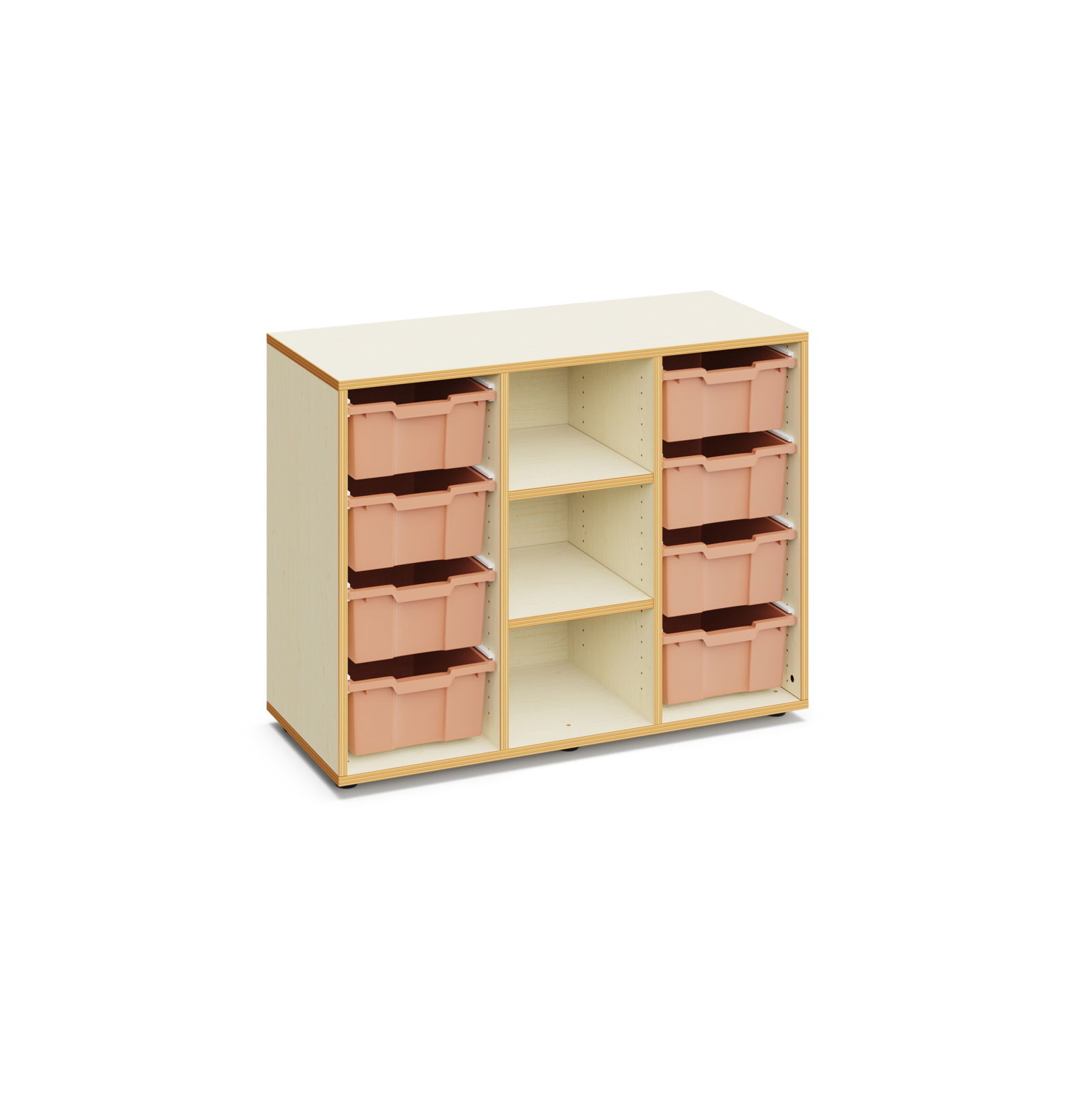 Das durchdachte Design des Regals unterteilt sich in drei funktionale Bereiche: Zwei Segmente bieten Platz für die acht hohen Kunststoffboxen, während das dritte Segment mit zwei stabilen Einlegeböden ausgestattet ist. Die Boxen mit den Maßen 42,5 x 15 x 31 Zentimetern bieten großzügigen Stauraum für voluminösere Lehrmittel, Bastelmaterialien oder Spielzeuge. Um das Regal harmonisch an Ihre Räumlichkeiten anzupassen, können Sie die Farbe der Behälter individuell wählen. Zur Verfügung stehen die ansprechenden Töne Hellterracotta, Hellblau, Hellgrün sowie ein dezentes Warmes Grau.