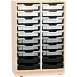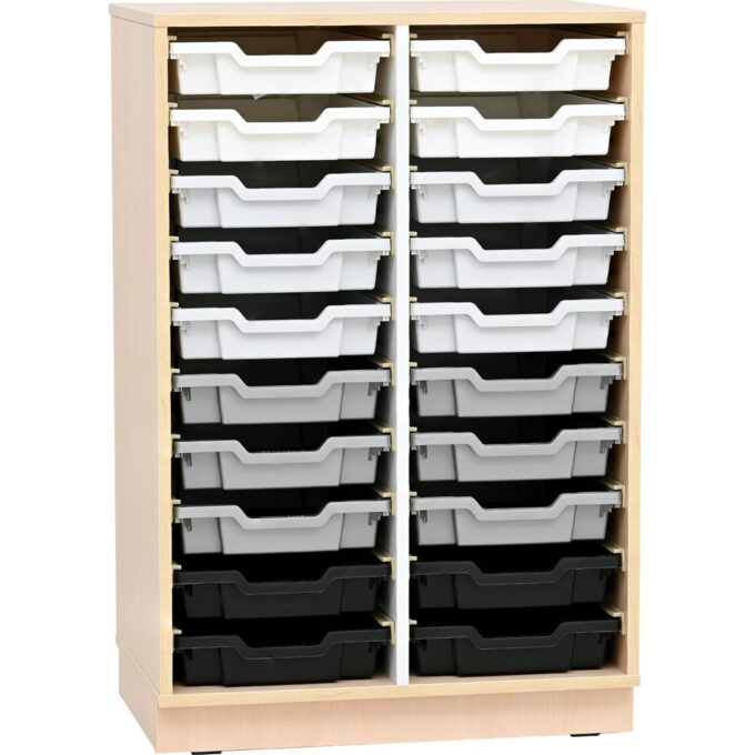 Dieses zweireihige Regal bietet großzügigen Stauraum, der durch die 20 flachen Kunststoffbehälter in vier verschiedenen Farben optimal genutzt wird. Die bruchsicheren und formstabilen Behälter sind perfekt für die tägliche Nutzung im pädagogischen Alltag. Die farbliche Vielfalt bringt zudem einen frischen und modernen Look in jeden Raum.