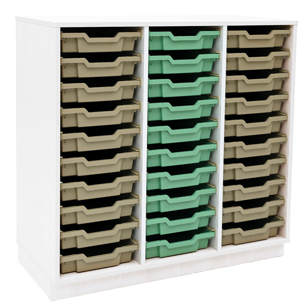 Dieses dreireihige, etwas höhere Möbelstück vereint einen äußerst stabilen Korpus mit 30 flachen, herausnehmbaren Kunststoffbehältern in den natürlichen Farben Beige und Pastellgrün. Mit diesem durchdachten Aufbewahrungssystem schaffen Sie mühelos eine strukturierte Umgebung, die Kindern und Erwachsenen den Alltag spürbar erleichtert. Die offene Gestaltung ermöglicht einen direkten Zugriff, während die bruchsicheren Boxen alles sicher an seinem Platz halten. Wir haben dieses Regal speziell für die enormen Belastungen in Bildungseinrichtungen entwickelt. Es fügt sich harmonisch in Ihre bestehende Einrichtung ein und unterstützt Sie jeden Tag dabei, eine produktive Wohlfühlatmosphäre zu erhalten.