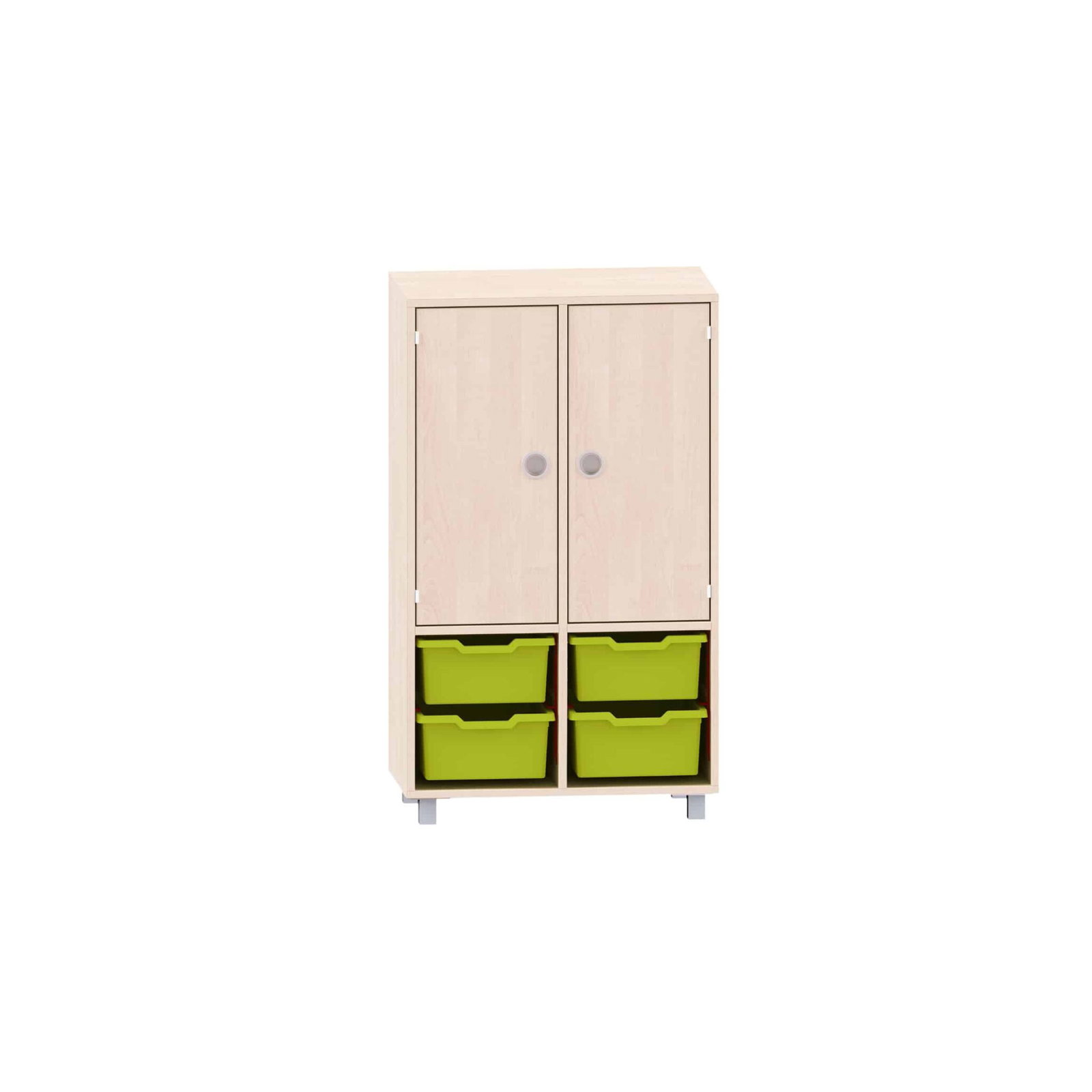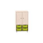 Regal mit 2 Böden, 2 Türen oben und unten 4 große ABS-Boxen für Kitas & Schulen