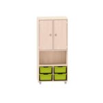 Regal mit 3 Böden, oben 2 Türen, mittleres Fach frei und unten 4 große ABS-Boxen für Kitas & Schulen