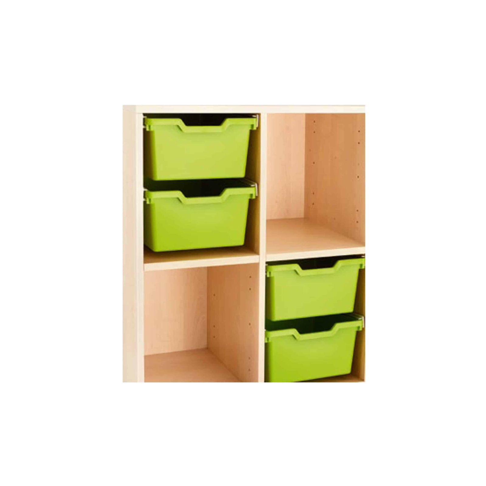 Unsere Regale mit ABS-Boxen bieten ideale Aufbewahrungsmöglichkeiten. Die robusten Kunststoffboxen sind ineinander und aufeinander stapelbar und außerdem leicht zu reinigen. Ihre Höhe beträgt entweder 7,5 cm (N1) oder 15 cm (N2). Der Korpus unserer Regale ist verleimt; die Mittelböden sind fester Bestandteil des Möbelsystems und mit Systemverbindern verschraubt. Ein Regalfach entspricht jeweils einer Ordnerhöhe. Die Türen lassen sich um 180° öffnen und werden mit runden Muschelgriffen aus Metall mit einem Durchmesser von 5 cm geliefert. Der Korpus ist in den Farben Buche Perle, Buche hell, Ahorn und Birke und die Boxen sind in den Farben Transparent, Rot, Gelb, Grün und Blau lieferbar. Zusätzlich können die Fronten auch in den vier Unifarben Gelb, Limone, Nachtblau und Chilirot bestellt werden. Wahlweise lassen sich die Regale mit einem Sockelkasten in der Farbe Steingrau oder Metallfüßen in RAL 9006 Weißaluminium liefern.