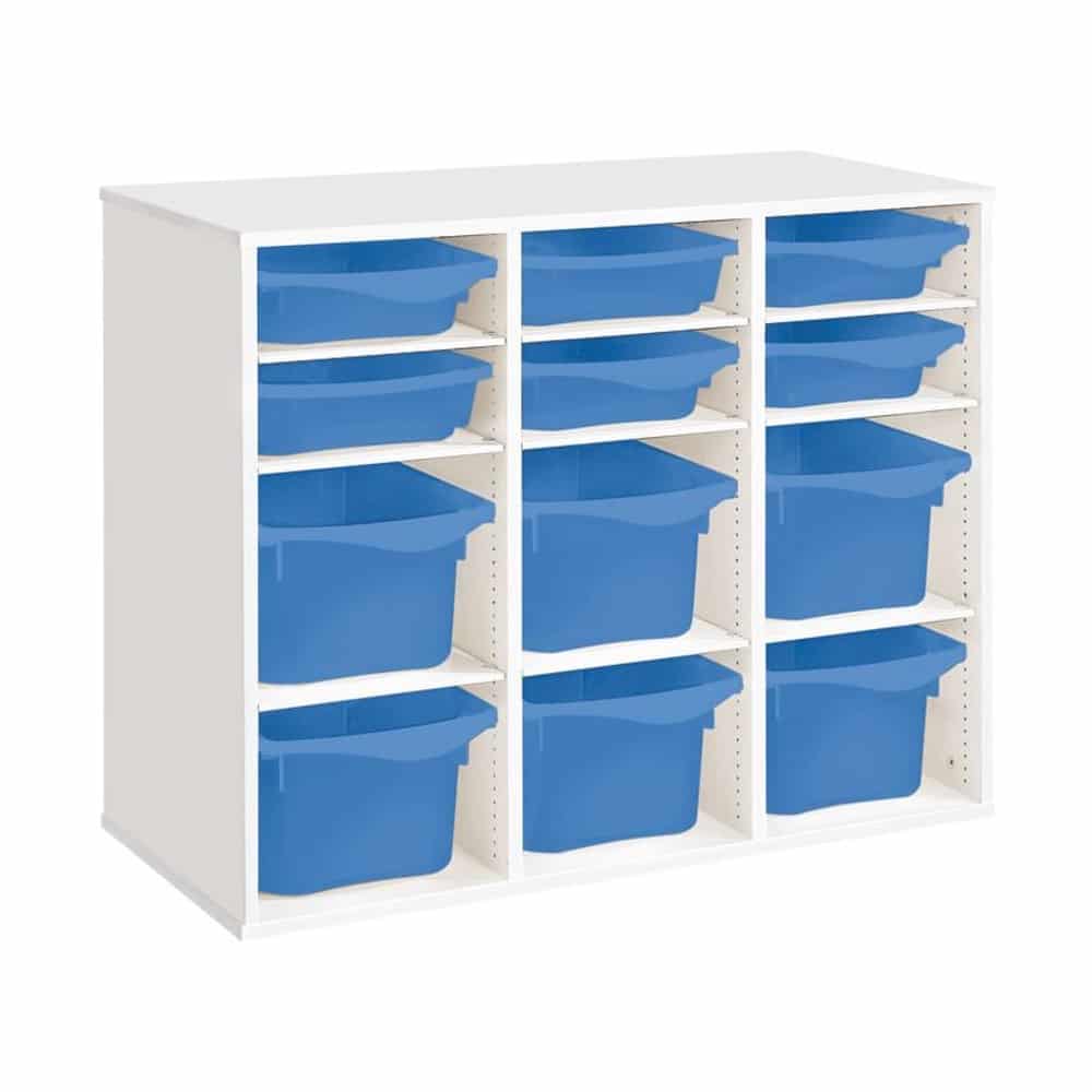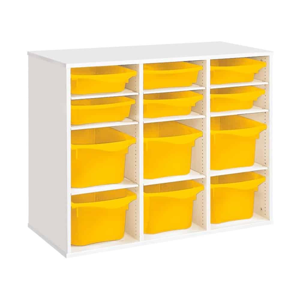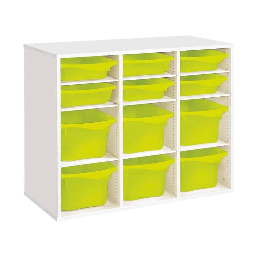 Regal mit Melaminbeschichtung mit 12 Behälter – 9 Regalbretter – Höhe: 81 cm – Länge: 105 cm