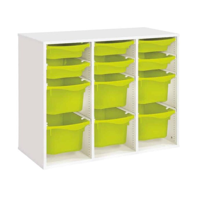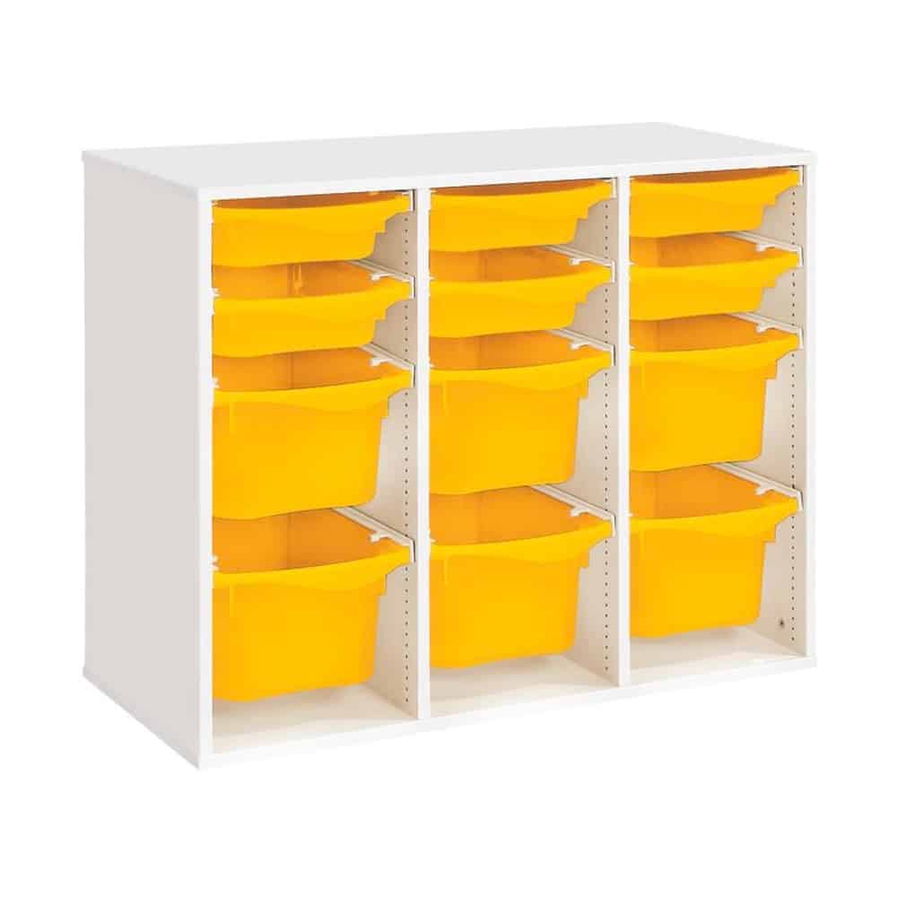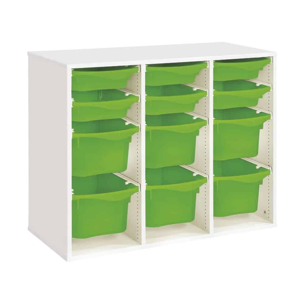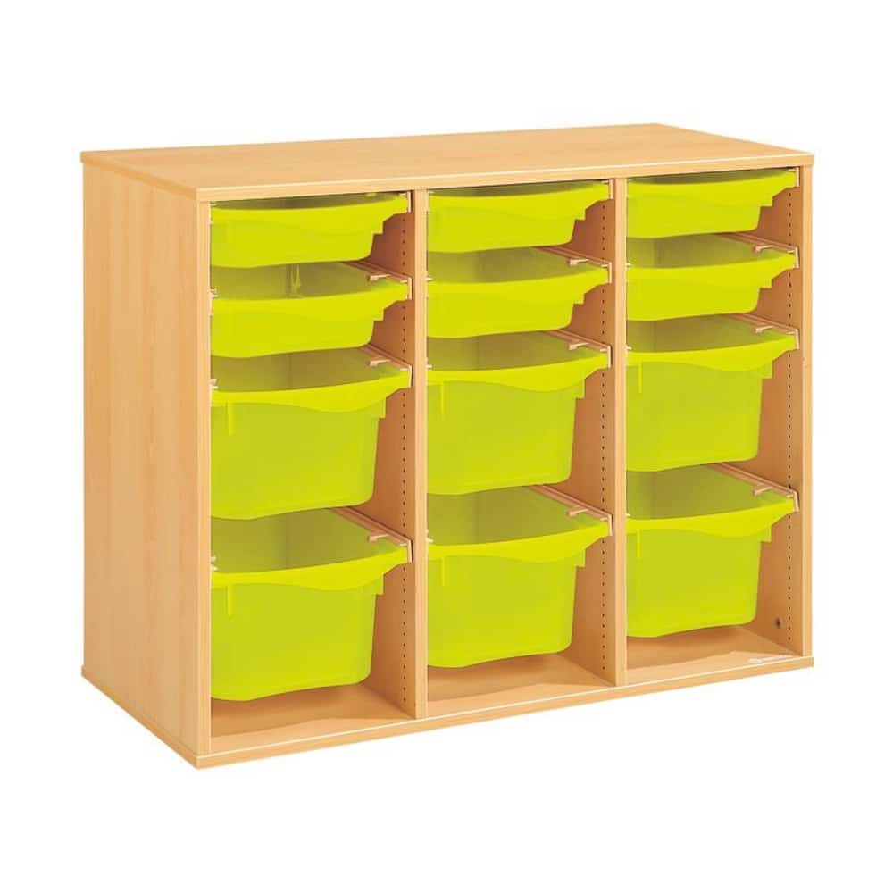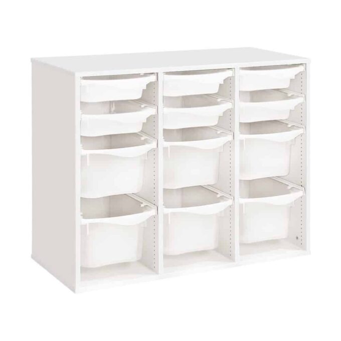 Regal mit Melaminbeschichtung mit 12 Behälter auf Schienen – Höhe: 81 cm – Länge: 105 cm