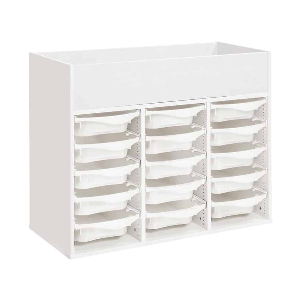 Regal mit Melaminbeschichtung mit 15 Behälter auf Schienen mit Zugriff oben – Höhe: 81 cm – Länge: 105 cm