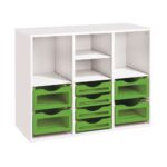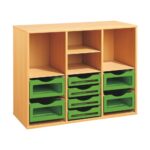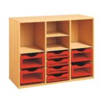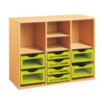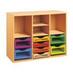 Regal mit Melaminbeschichtung mit 8 Holzbehälter auf Schienen – 4 Regalbretter – Höhe: 81 cm – Länge: 105 cm