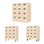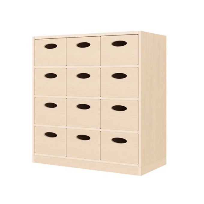 Dank seiner kompakten Maße von 80 x 39 x 79 cm fügt sich der Schrank nahtlos in jedes Raumkonzept ein, bietet jedoch durch die 12 integrierten Materialkästen erstaunlich viel Stauraum. Die kindgerechte Höhe erlaubt es den Kindern, eigenständig Materialien zu entnehmen und wieder aufzuräumen – ein wichtiger Beitrag zur Förderung von Ordnungssinn und Selbstständigkeit.