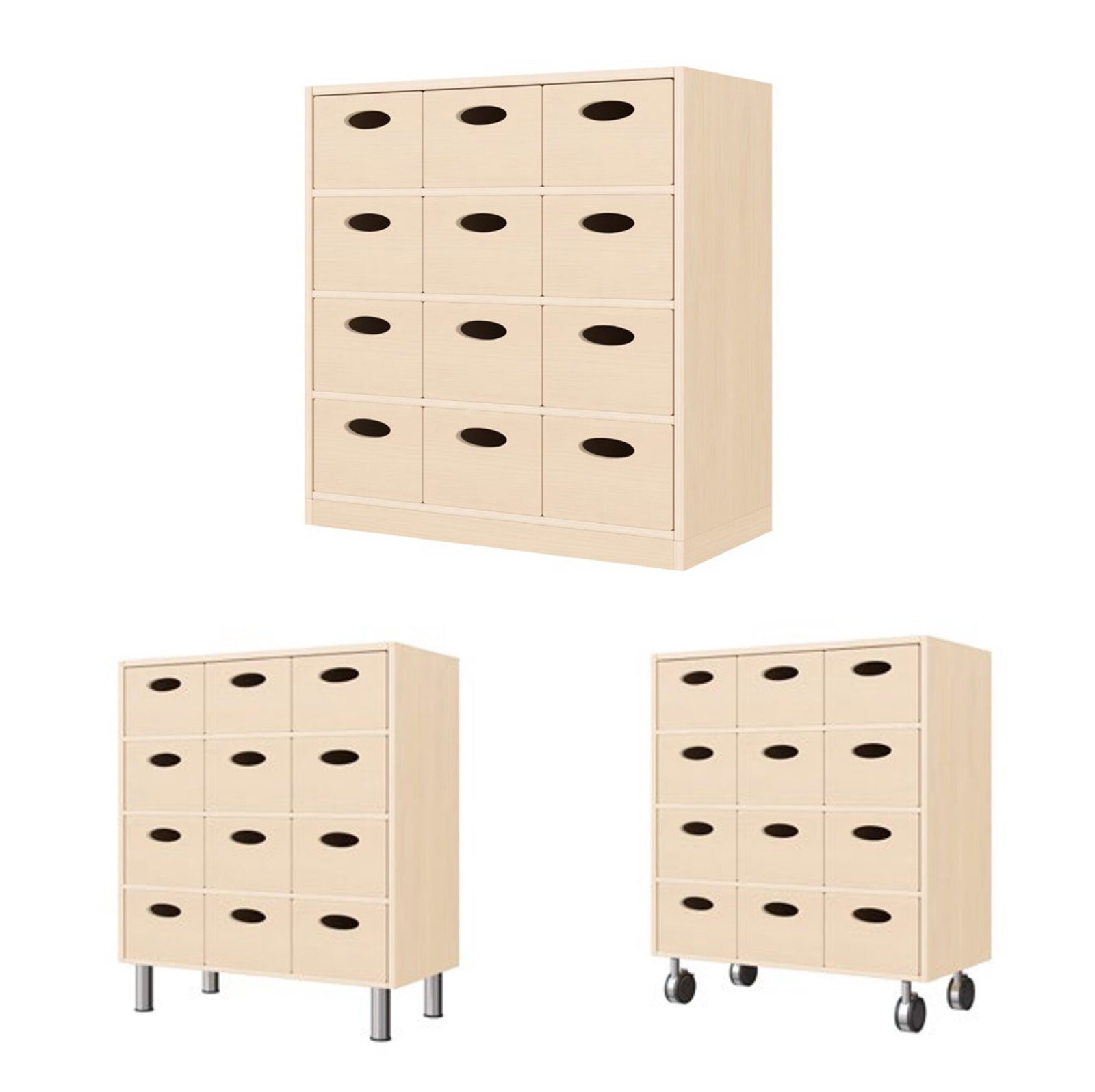 WISDOM Regalschrank mit 12 Materialkästen: robust, pflegeleicht & flexibel. Mit Rollen, Sockelfüßen oder Holzsockel – ideal für Kitas & Schulen.