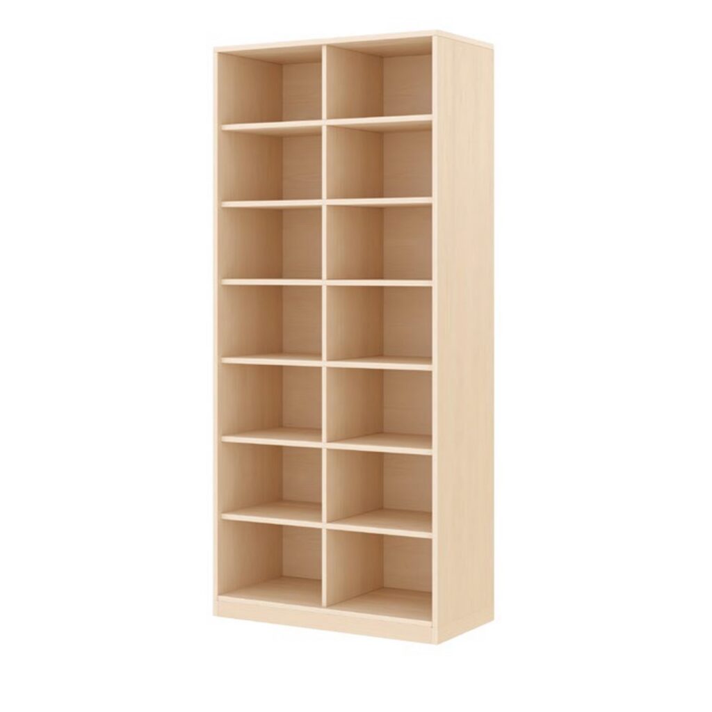 Die 14 gleichgroßen Fächer bieten ausreichend Platz für Bücher, Lernmaterialien, Spielzeug oder Bastelutensilien. Durch die offene Gestaltung bleibt der Inhalt stets sichtbar und leicht zugänglich – ideal für Bildungseinrichtungen, Gruppenräume oder Büros. Dank des stabilen Holzsockels steht der Schrank fest und sicher, während die vorgeschriebene Wandbefestigung zusätzliche Stabilität und Sicherheit gewährleistet.