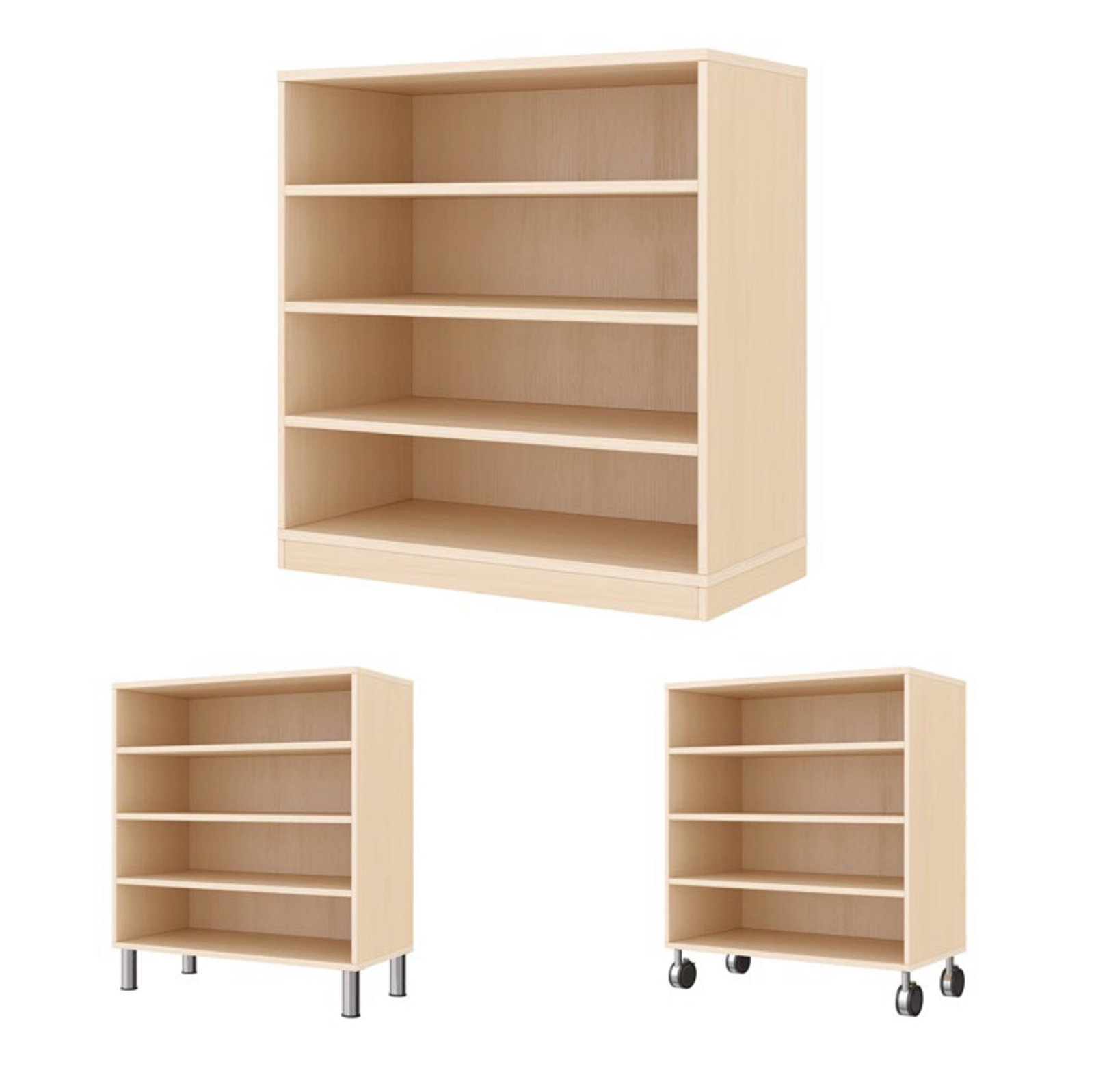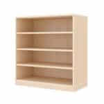 WISDOM Regalschrank mit 4 Fächern: robust, flexibel & pflegeleicht. Ahorn-Optik, mit Rollen, Sockelfüßen oder Holzsockel – ideal für Kitas & Schulen.