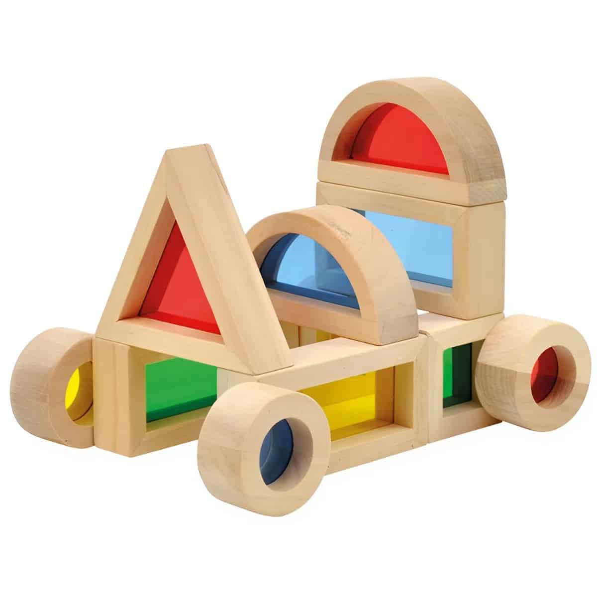 Die Regenbogenblocks sind Teamplayer.- Erweiterung: Sie lassen sich wunderbar mit herkömmlichen Holzbausteinen kombinieren. Ein schlichter Holzturm bekommt durch ein „Regenbogen-Fenster“ oder ein „Spiegel-Dach“ sofort einen besonderen Charakter.