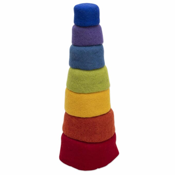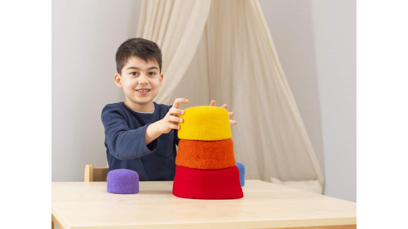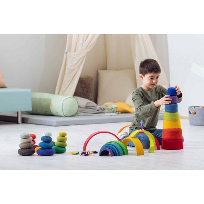 Die Regenbogen-Filzschalen sind nicht nur ansprechend in ihren leuchtenden Farben, sondern auch äußerst vielseitig einsetzbar. Kinder können die Schalen ineinander oder aufeinander stapeln, um beeindruckende Türme zu bauen oder verschiedene Muster zu kreieren. Dadurch werden nicht nur die motorischen Fähigkeiten unterstützt, sondern auch die Kreativität angeregt.