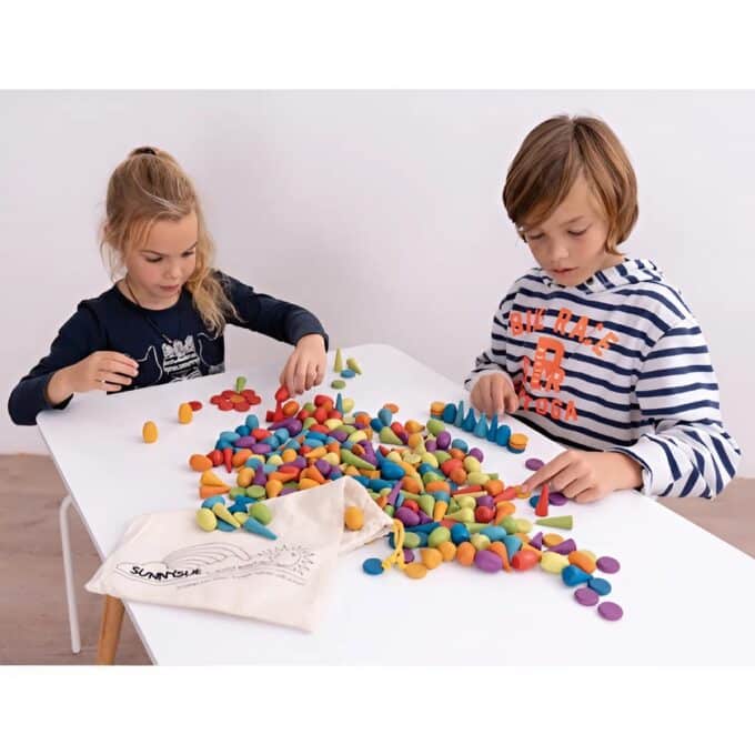 - Sortieren und Kategorisieren: Das Spiel lädt intuitiv dazu ein, die Steine nach Farben, Formen oder Größen zu ordnen. Dies schult das logische Denken und bildet eine spielerische Vorstufe zum mathematischen Verständnis.