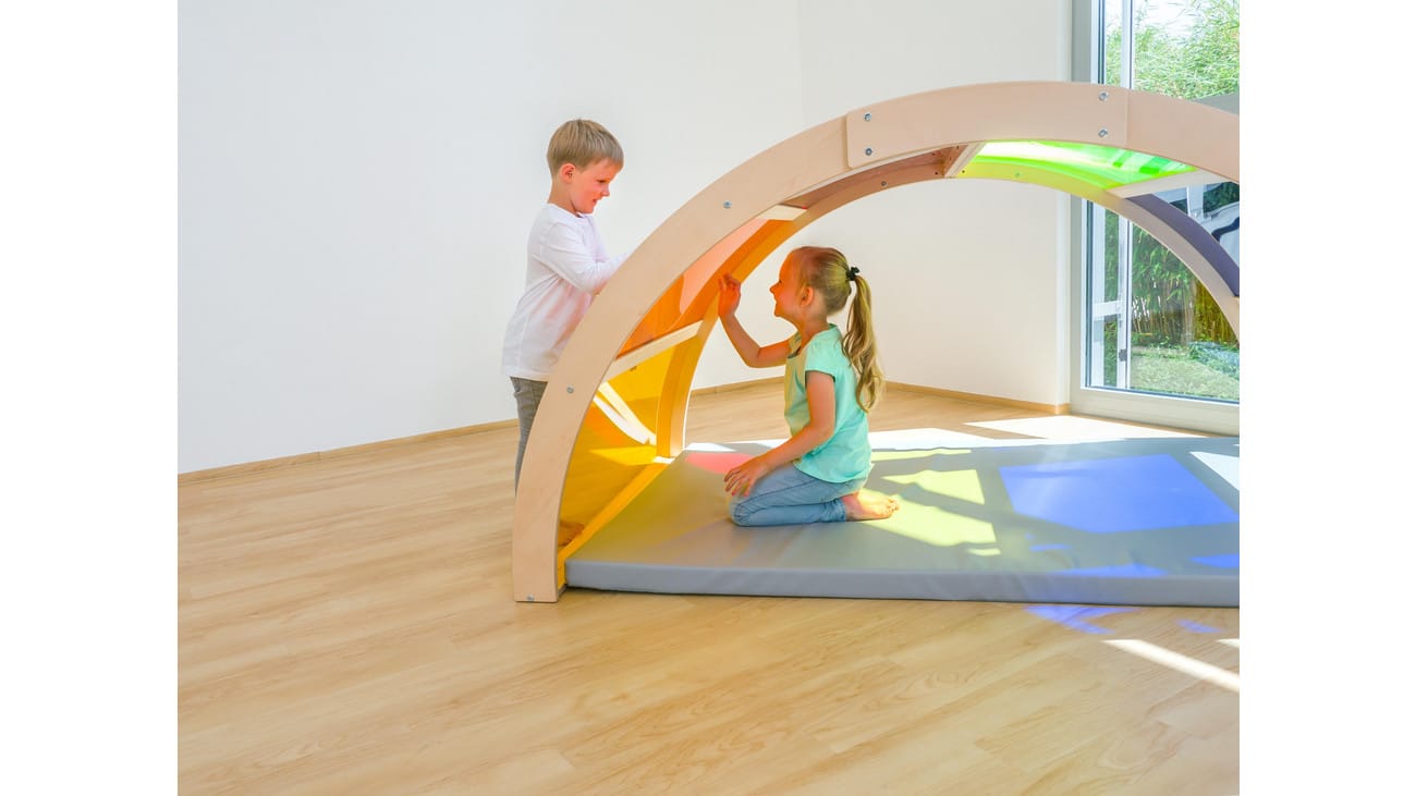 Der Regenbogen ist aus leuchtendem, verschiedenfarbigem Acrylglas gefertigt, das durch einfallendes Licht magisch beleuchtet wird. In den strahlenden Farben Gelb, Orange, Rot, Grün, Blau und Weiß erstrahlt er und schafft ein faszinierendes Farbenspiel, das auf den Kleidern und dem Boden der Kinder wirkt. Dieses wunderbare Licht- und Farbenspiel zieht die Kinder in seinen Bann und fördert die visuelle Wahrnehmung.