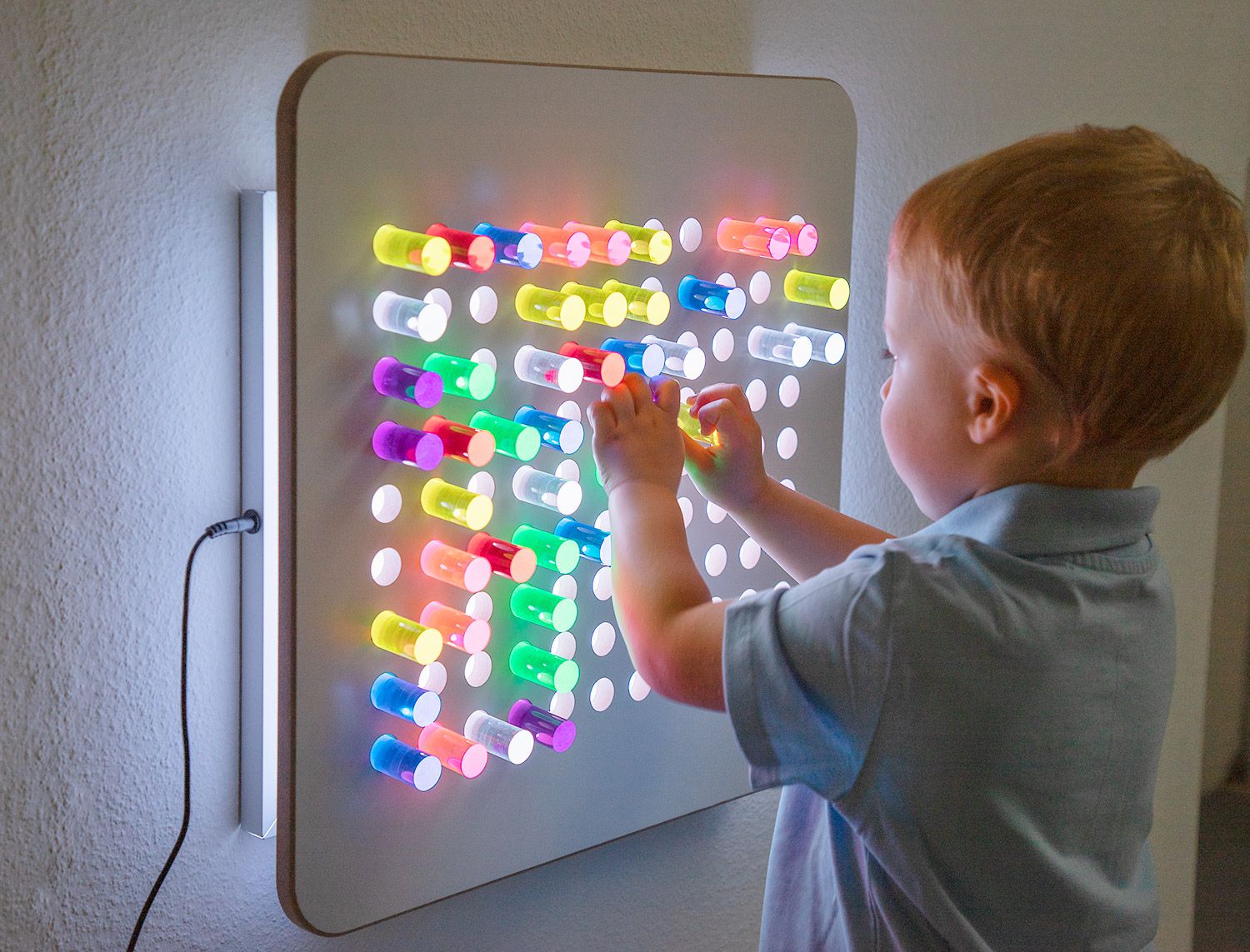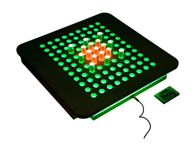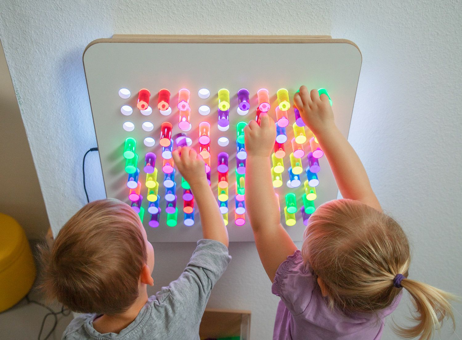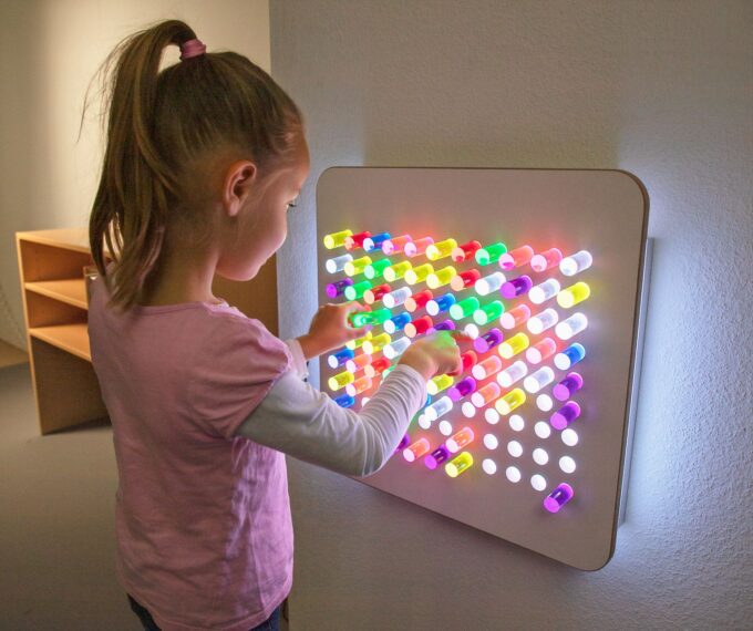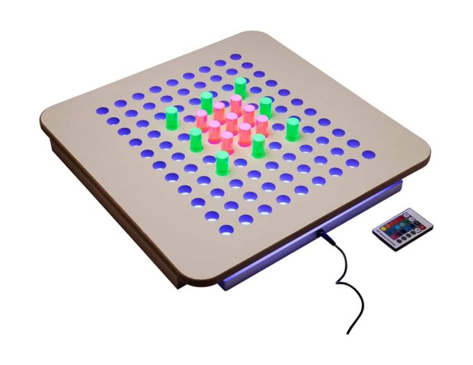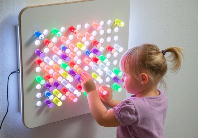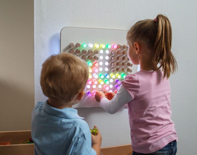 - Farbenfrohes Lernen: Mit der speziellen eingeschobenen Lichtplatte (102 684) und dem integrierten Farbwechsler verwandeln sich die gesteckten Bilder in ein atemberaubendes Farbenspiel. Kinder erleben Licht und Farbe hautnah, was ihre visuelle Wahrnehmung intensiviert und ihre Experimentierfreude anregt.