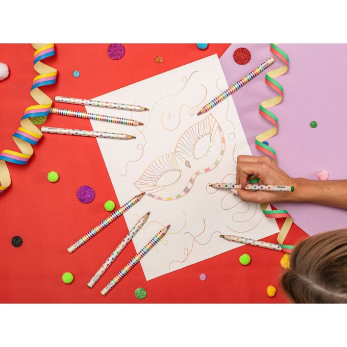 Die Betzold Regenbogen-Buntstifte kombinieren lebendige, mehrfarbige Möglichkeiten mit einem durchdachten, ergonomischen Design, das sie zu einem Vergnügen macht. Ob zur Förderung der Feinmotorik junger Lernender, zur Inspiration erfahrener Künstler oder einfach, um verregnete Nachmittage zu verschönern – diese Stifte wecken mit jedem Strich Staunen und Fantasie. Fügen Sie sie noch heute zu Ihren Kunstmaterialien hinzu und erleben Sie, wie Kreativität in magischen Farben erblüht.