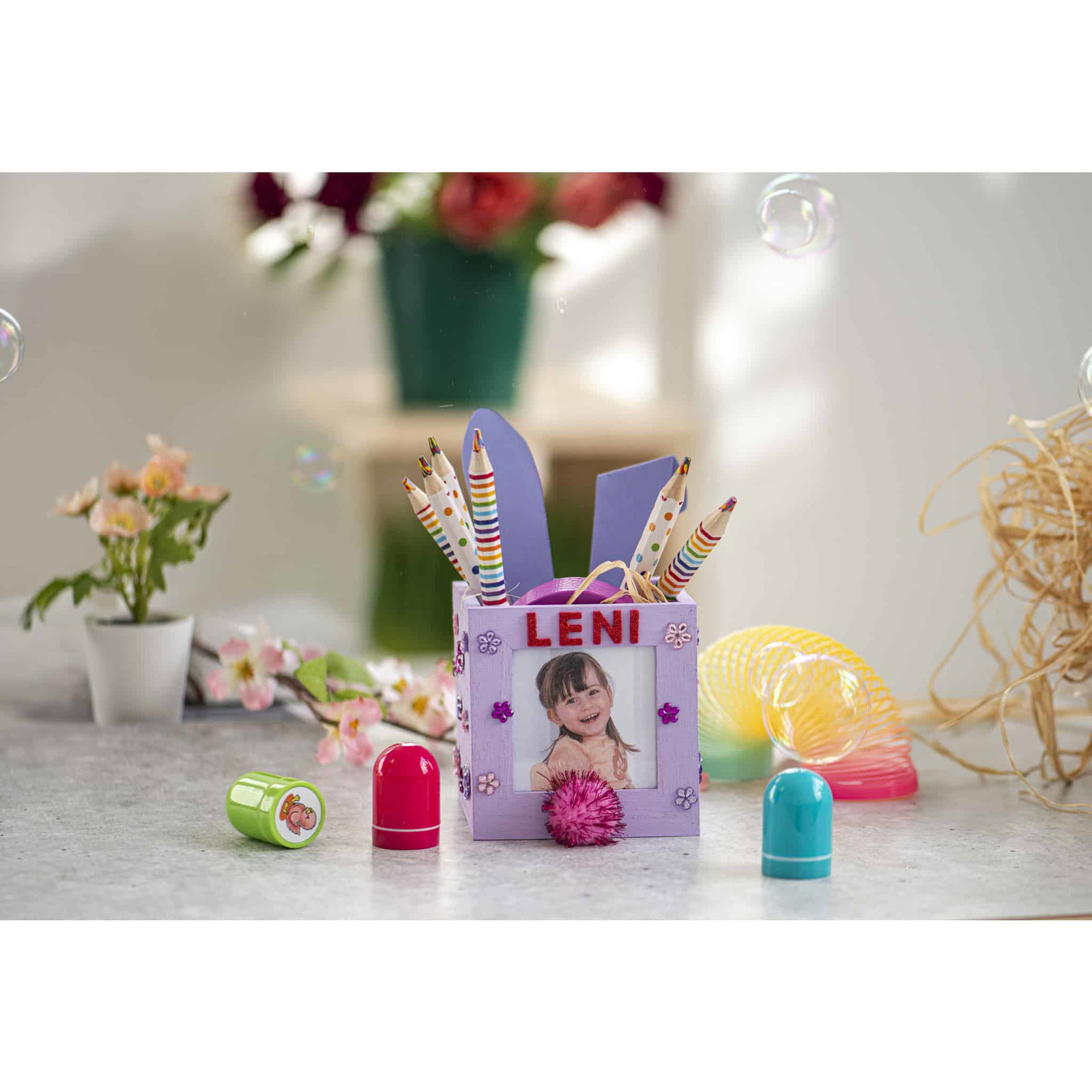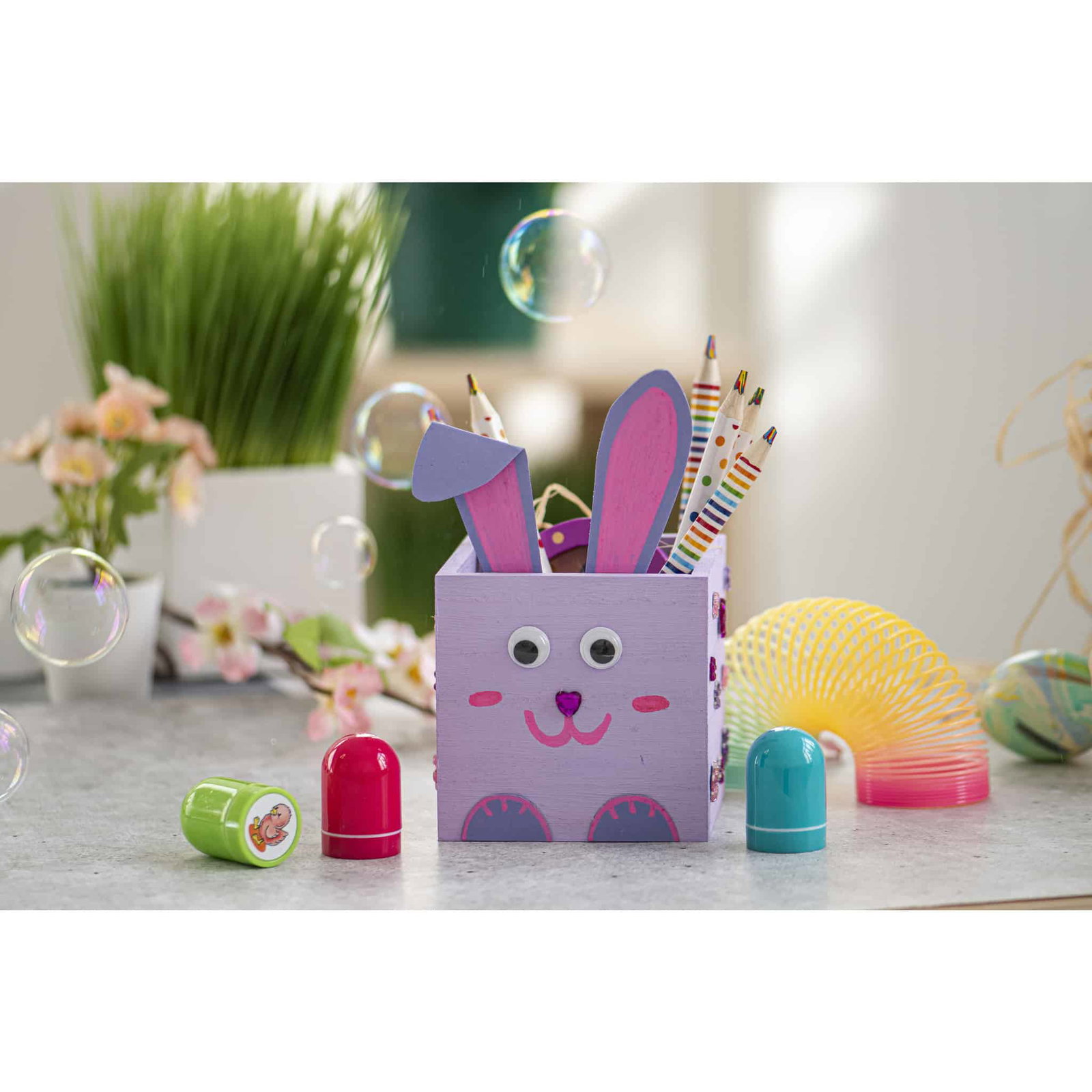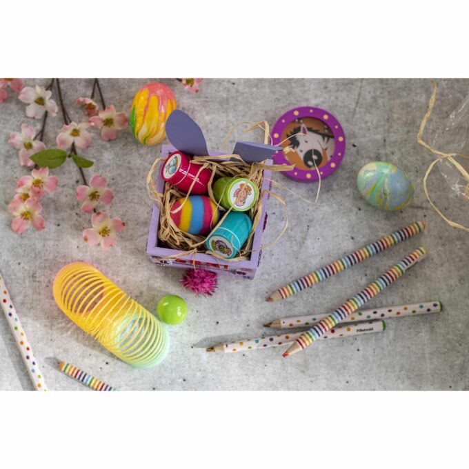 - Zwei Stiftdesigns – gestreift und gepunktet in bezaubernden Regenbogenmustern.
