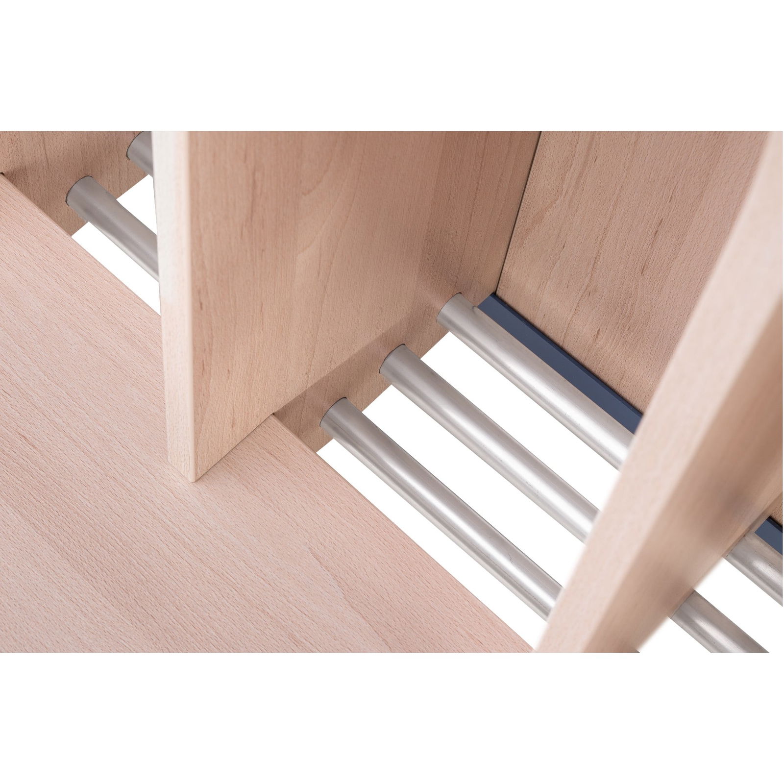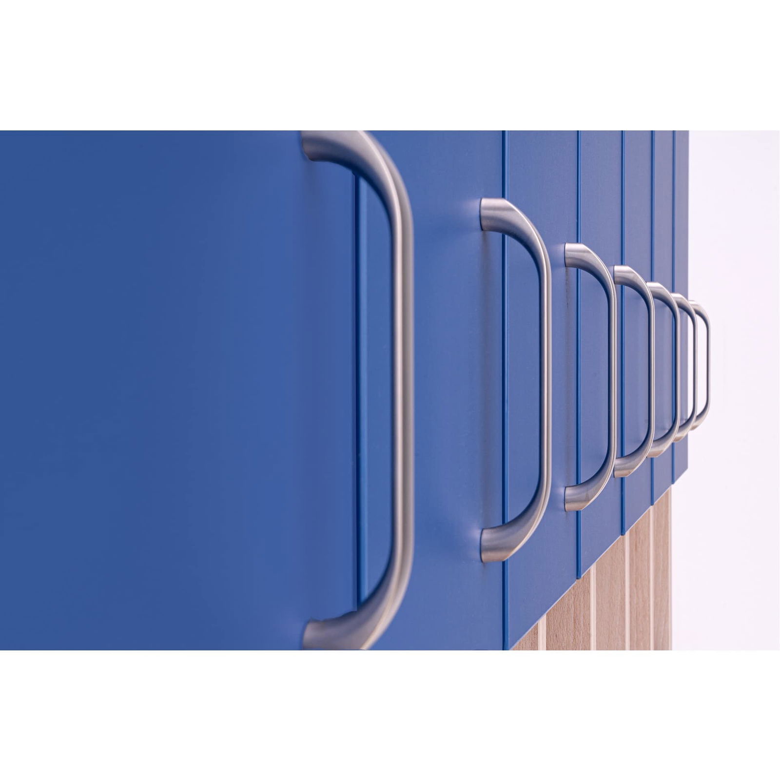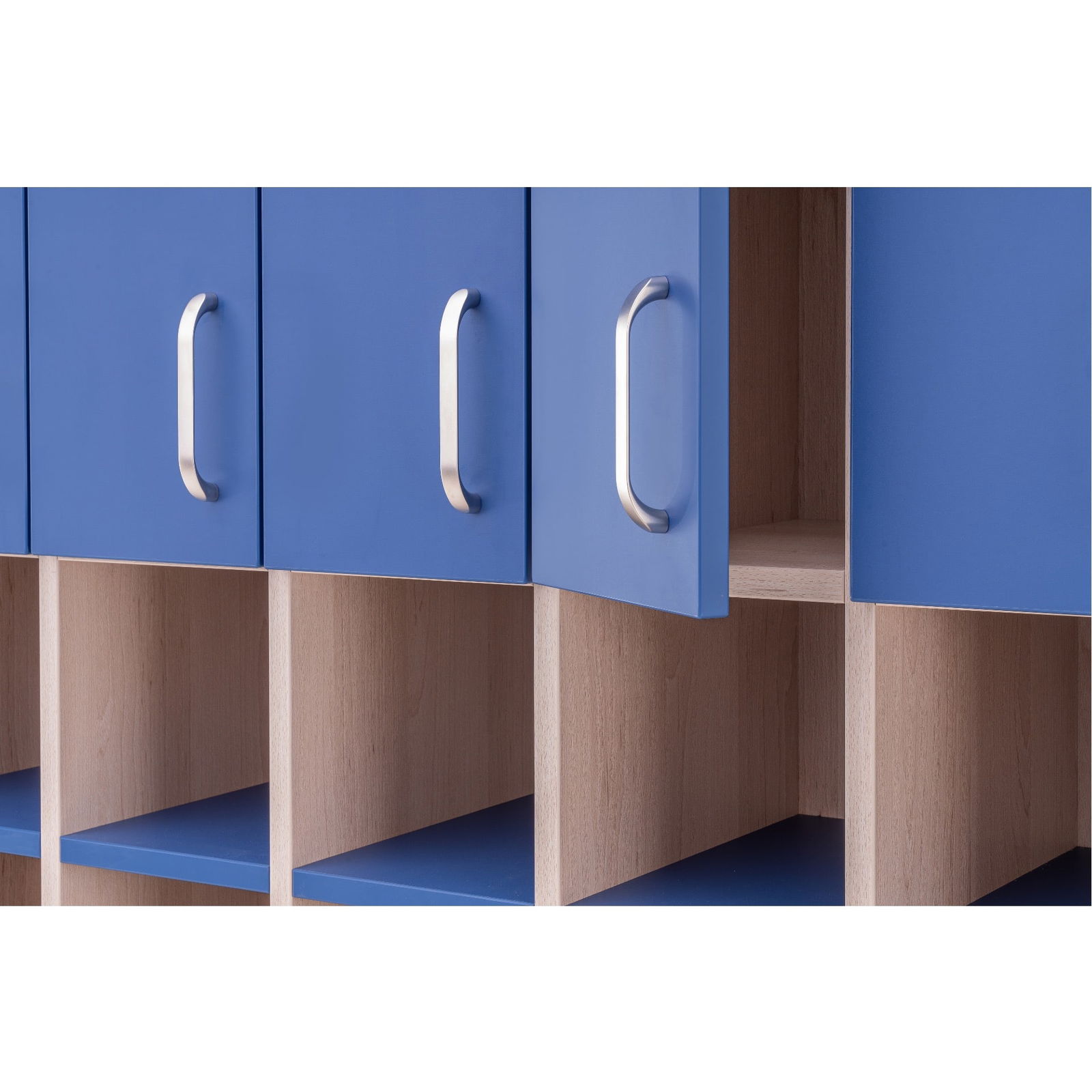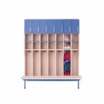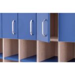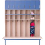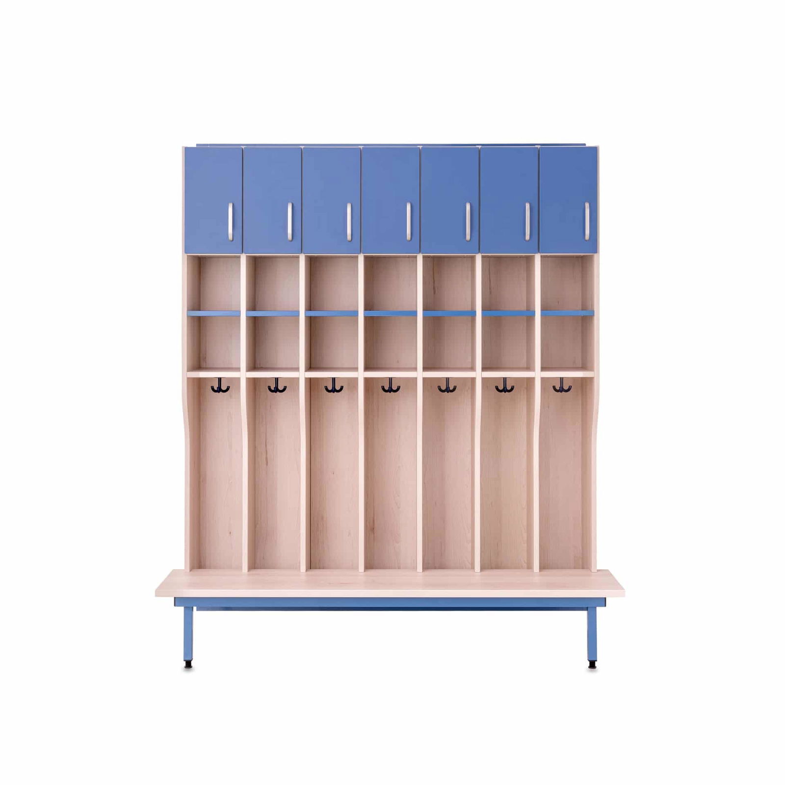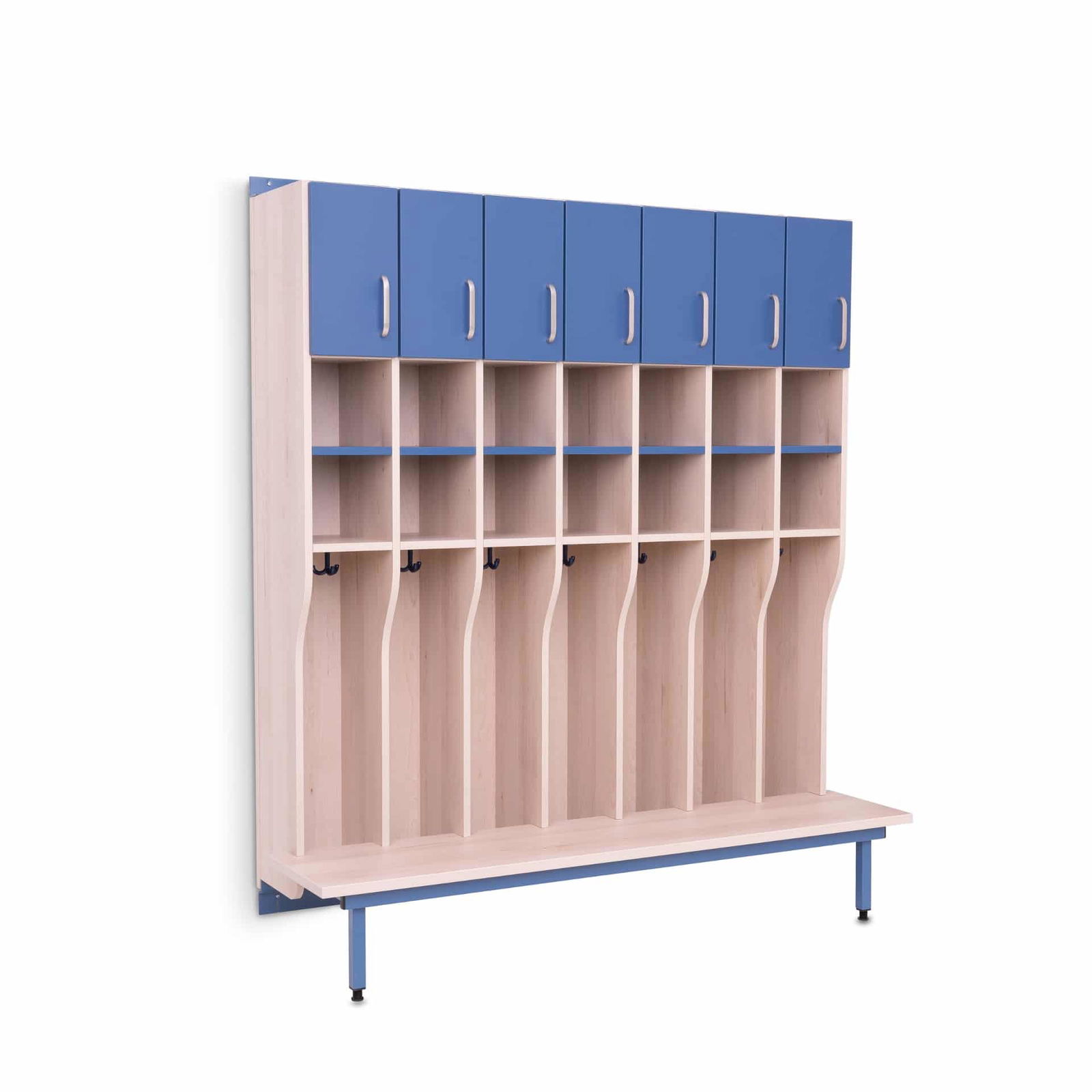 Unsere „Exklusiv“- Reihengarderobe ist ein Materialmix aus 19 und 25 mm Spanplatten mit einer pflegeleichten Melaminoberfläche und einem pulverbeschichteten Stahlgestell. Für jedes Kind gibt es ein hohes Fach mit Tür und 2 niedrige offene Fächer. Das Jackenfach ist mit einem Dreifachhaken ausgestattet. Die Fachtiefe der oberen Fächer ist 31 cm, die des Jackenfaches 26 cm. Hinter der Sitzfläche befindet sich ein Aluminium- Schuhrost.