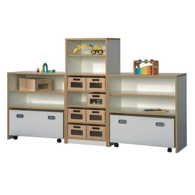 - Zwei große Rollkästen: Diese mobilen Raumwunder sind perfekt für die Aufbewahrung von großen, unhandlichen Spielsachen wie Bausteinen, Fahrzeugen oder Verkleidungsutensilien. Dank der robusten Rollen können die Kinder die Kästen selbstständig zum Spielort ziehen und das Aufräumen wird zu einem aktiven, einfachen Prozess.