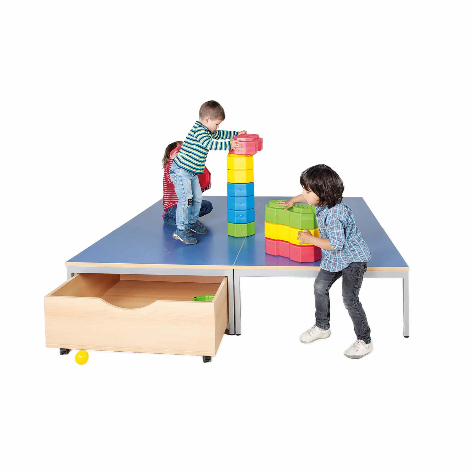 - Großzügige Dimensionen: Ob als 1×1 Meter großes Quadrat oder als beeindruckendes 2×1 Meter großes Rechteck – diese Podeste schaffen weitläufige, erhöhte Ebenen, die zum gemeinsamen Spielen, Bauen und Lernen einladen. Sie sind die ideale Bühne für den Morgenkreis, Theateraufführungen oder Präsentationen.