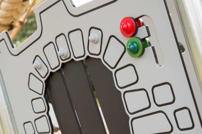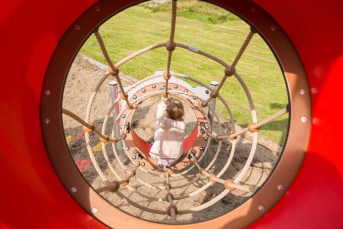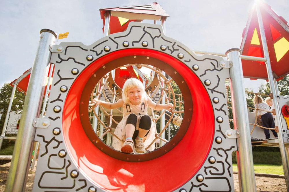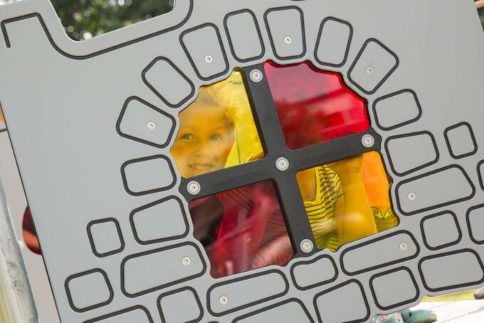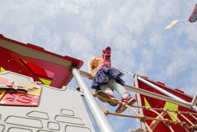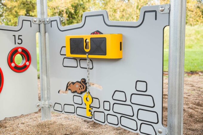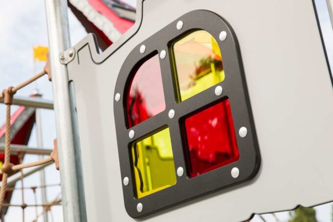 Arthur ist eine hexagonal angelegte Burg, die massig Spaß bietet und sich perfekt zum Fangenspielen oder beispielsweise für „Der Boden ist Lava“ eignet. Obendrein bietet Arthur viele spielerische Möglichkeiten zwischen den Türmen. Die Spielanlage hat alles, was das verspielte Herz begehrt – Spielwände, schwingende und schräge Hängebrücken, einen Ausguck samt beweglichem Teleskop, Hängegriffe und vieles mehr. Durch gelbe und rote transparente Scheiben im Dach entstehen auf dem Boden je nach Sonnenstand unterschiedliche Muster, die zum Spielen von „Himmel und Hölle“ animieren. Außerdem bieten sie die perfekte Vorlage für „Der Boden ist Lava“.