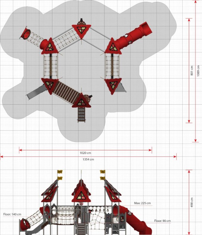 - Platzbedarf inkl. Sicherheitsabstände (LxB): 1354 x 1089 cm