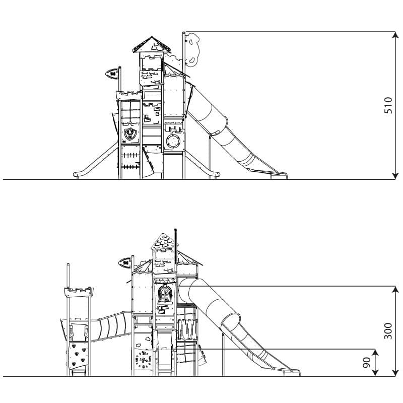 Technische Daten Ritter-Spielanlage mit 2 Rutschen, Röhrenrutsche und Kletterelementen CASTILLO 3028-1 von Vinci Play