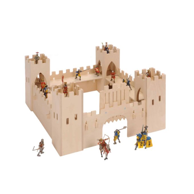 Ritterburg aus Holz – Einfacher Aufbau; die Türme werden mit den Mauern zusammengesteckt. Das Falltor ist stufenlos feststellbar. Die Burg kann auch anders als abgebildet zusammengesteckt werden.
