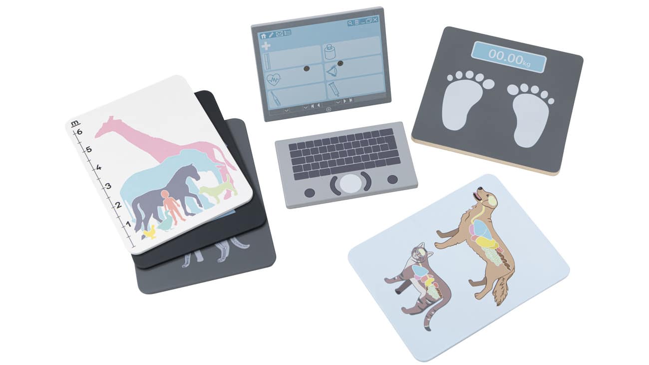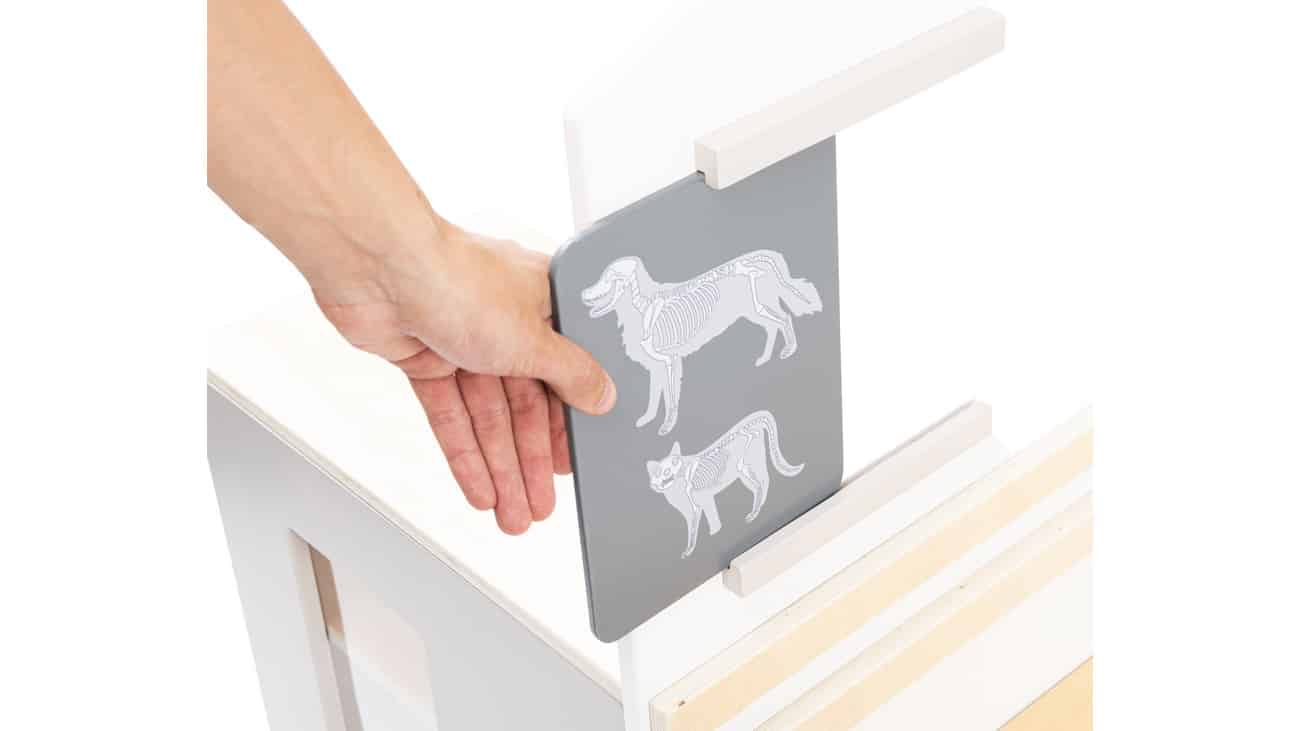 - Vielfältige Rollen und Szenarien: Mit dem Rollenspiel-Center können Kinder in die Welt der Berufe eintauchen. Sie können Röntgenbilder untersuchen, Patienten wiegen oder den Herzschlag kontrollieren. Dieses Spielmöbel hilft nicht nur bei der Entdeckung des Arztberufs, sondern bietet auch die Möglichkeit, eine Tierarztpraxis nachzuspielen. Die vier Tafeln zeigen die Organe und das Skelett eines Menschen sowie die eines Hundes und einer Katze und bringen den Kleinen wichtige medizinische Konzepte spielerisch näher.