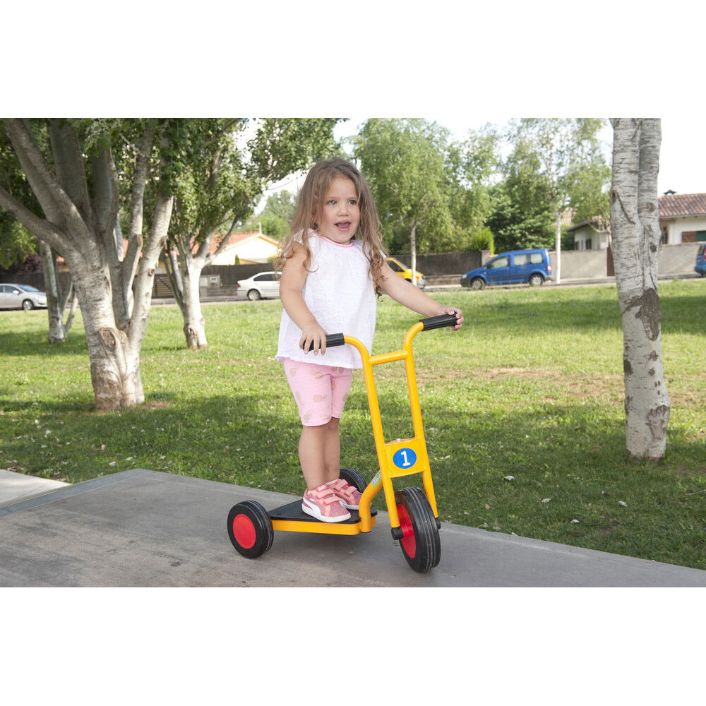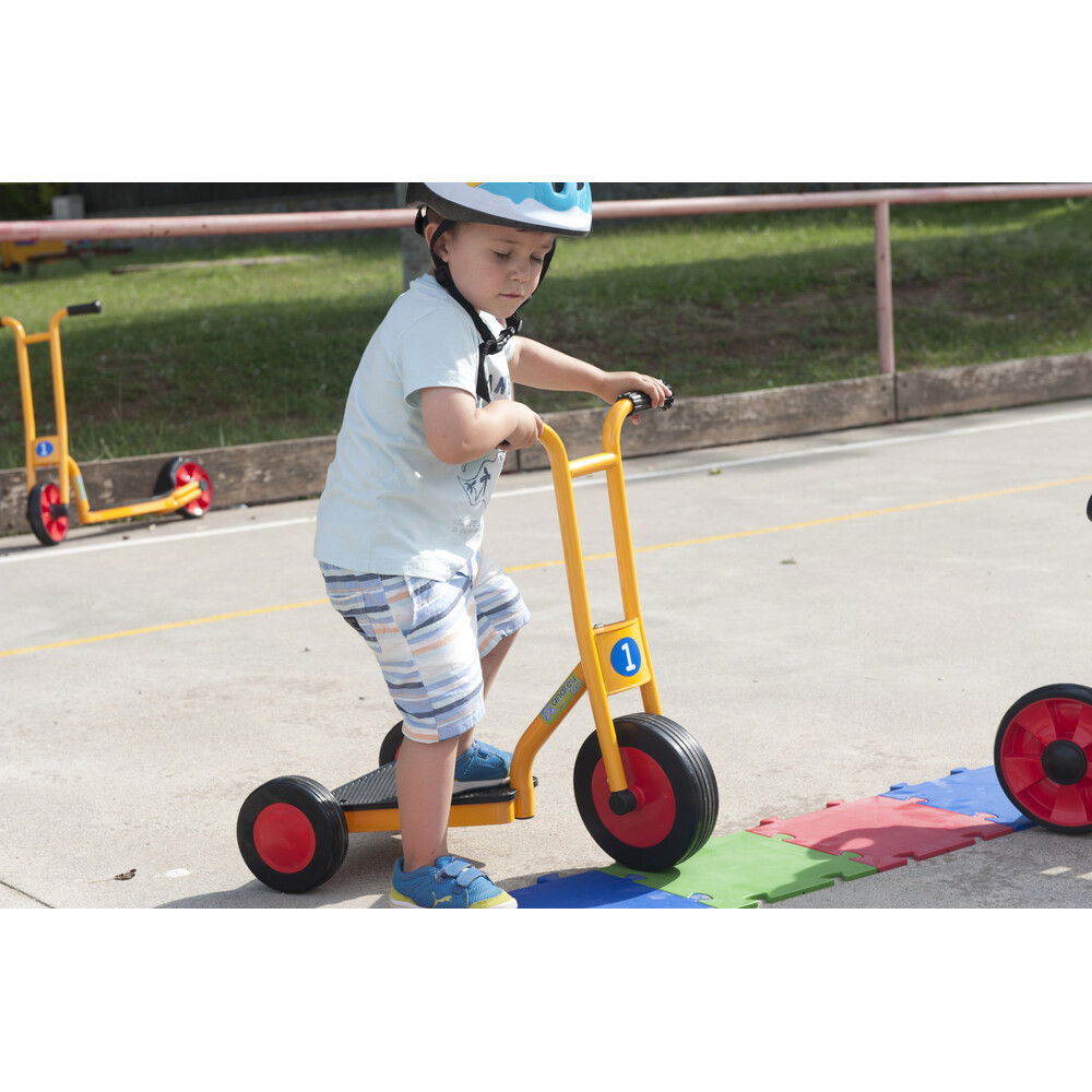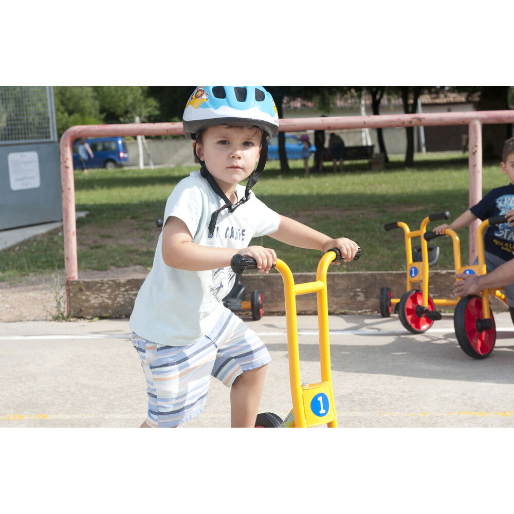 Anders als Modelle für ältere Kinder, setzt der „Funny“ auf maximale Standfestigkeit. Seine extra breiten Räder sorgen dafür, dass der Roller nicht so leicht kippt und vermitteln den kleinen Fahrern sofort ein Gefühl von Sicherheit. Gefertigt aus hochwertigen Materialien, die auch den rauen Alltag in Betreuungseinrichtungen problemlos überstehen, ist dieser Roller ein langlebiger Begleiter. Er kombiniert spielerische Leichtigkeit mit einer robusten Bauweise, die Eltern beruhigt und Kinder begeistert. Mit diesem Fahrzeug wird jede Fahrt zu einem fröhlichen Erlebnis, bei dem die Freude an der Bewegung im Mittelpunkt steht.