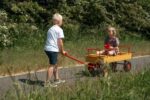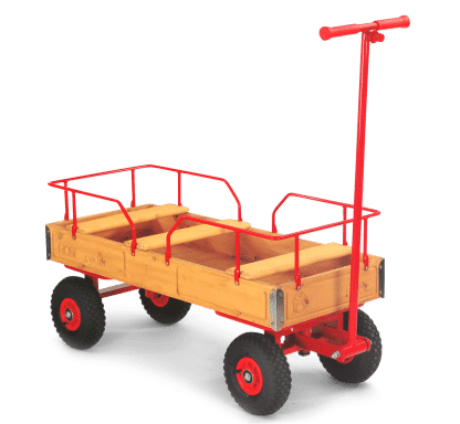 Der ROSE-Wagen ist mit Handläufen, drei Sitzen und vier Ballonreifen ausgestattet, was ihn zu einer erstklassigen Wahl für verschiedene Umgebungen wie Kindergärten, Schulen, Spielplätze, Campingplätze, Parks, Wälder und andere Bereiche mit Spielplätzen macht. Der Wagen ist ideal für den Transport von Kindern, Lebensmitteln und anderen notwendigen Gegenständen.