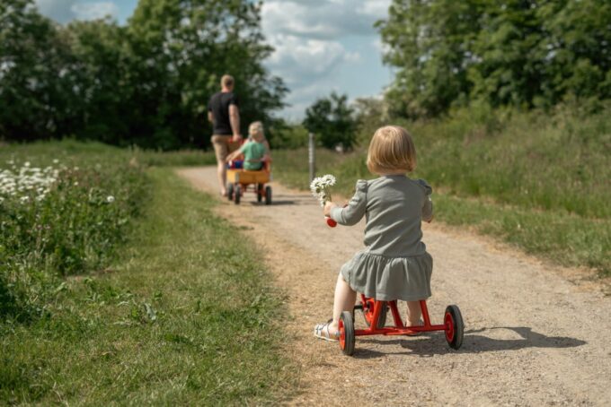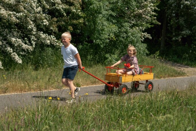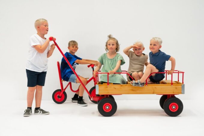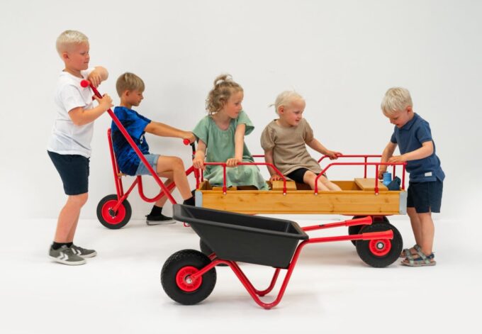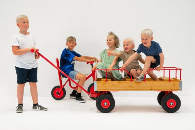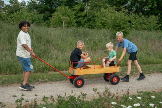 Der ROSE-Wagen ist mit Handläufen, drei Sitzen und vier Ballonreifen ausgestattet, was ihn zu einer erstklassigen Wahl für verschiedene Umgebungen wie Kindergärten, Schulen, Spielplätze, Campingplätze, Parks, Wälder und andere Bereiche mit Spielplätzen macht. Der Wagen ist ideal für den Transport von Kindern, Lebensmitteln und anderen notwendigen Gegenständen.