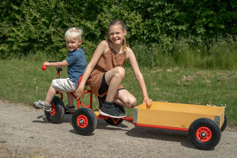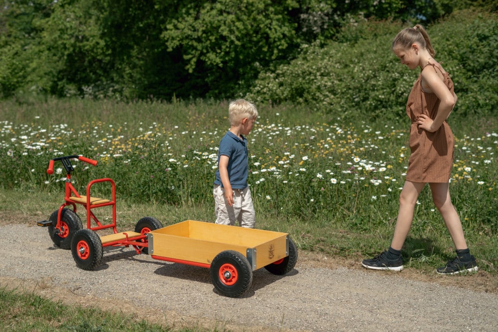 Mit einem Anhänger wird das Dreirad sofort zum Lastwagen, was den Kindern noch mehr Spaß macht.