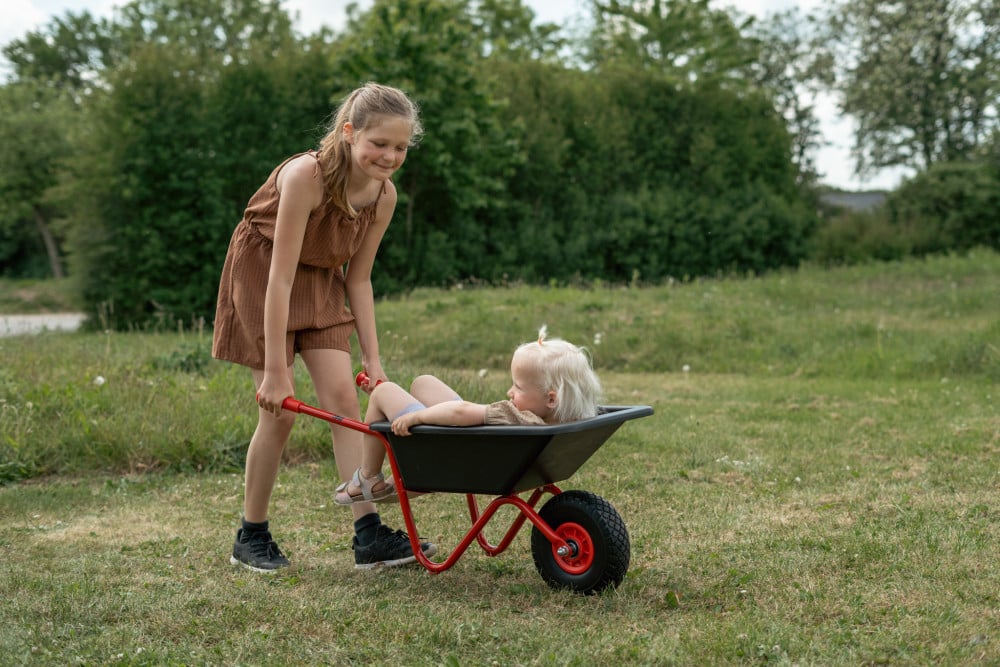 Die Schubkarre ist ein unglaublich multifunktionales Werkzeug für Kinder. Sie können damit nicht nur Löcher graben und Sand herumtragen, sondern auch Sandburgen bauen, Blumen und Gemüse pflanzen und sich anderen lustigen Gartenaktivitäten widmen. Es ist ein wesentlicher Bestandteil jedes Kindergartenhofs und wird von Kindern immer gerne genutzt. Mit ihren vielfältigen Einsatzmöglichkeiten bietet die Schubkarre Kindern unzählige Möglichkeiten zum Lernen und Spielen und ist somit eine wertvolle Ergänzung für jeden Spielbereich im Freien.
