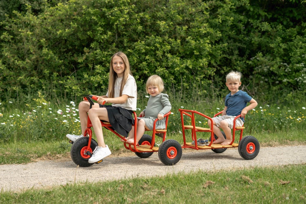 Mit einem Anhänger wird das Dreirad sofort zum Lastwagen, was den Kindern noch mehr Spaß macht.