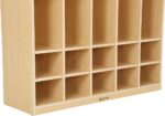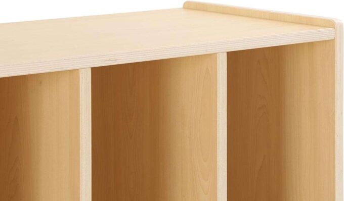 Das Regal ist aus hochwertigem Pappel-Multiplex gefertigt und mit einer strapazierfähigen Melaminbeschichtung in einer ansprechenden Ahorn-Optik versehen. Dadurch ist es nicht nur äußerst stabil, sondern auch leicht zu reinigen und widerstandsfähig gegenüber den Herausforderungen des Alltags im Kindergarten.