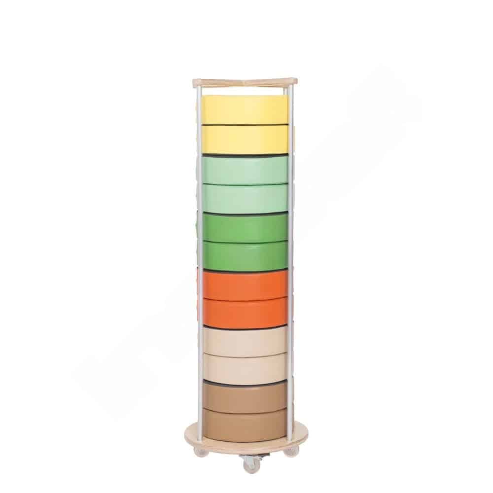 Für den Einsatz in Kitas und Schulen sind robuste und pflegeleichte Materialien unerlässlich. Der Bezug der Sitzkissen besteht aus einem hochwertigen, widerstandsfähigen Kunstleder, das den hohen Belastungen des Alltags problemlos standhält. Das Material ist nicht nur schwer entflammbar, sondern auch vollständig phthalatfrei, was höchste Sicherheit für die Gesundheit der Kinder garantiert. Sollte einmal etwas danebengehen, lässt sich die Oberfläche mühelos mit einem feuchten Tuch abwischen. So bleiben die Kissen stets hygienisch sauber und einsatzbereit. Für eine platzsparende und ordentliche Aufbewahrung können Sie das Set mit einem separat erhältlichen Ständer (Art.-Nr. 855231) oder einem praktischen Rollwagen (Art.-Nr. 855627) ergänzen.