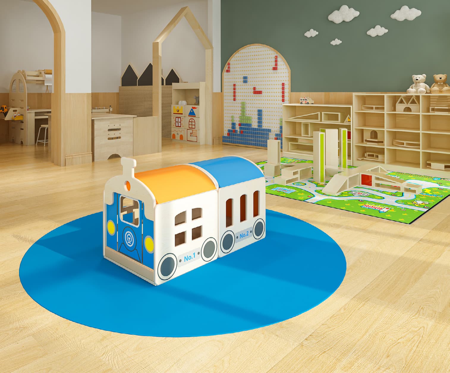 Der Runde Bodenteppich mit einem großzügigen Durchmesser von 200 cm eignet sich bestens für Gruppenaktivitäten und lädt die Kinder dazu ein, in einer harmonischen Umgebung zu spielen und zu lernen. Die verschiedenen Farben – Grau, Beige, Grün und Blau – lassen sich perfekt in jedes Raumkonzept integrieren und fördern eine angenehme und ruhige Atmosphäre.