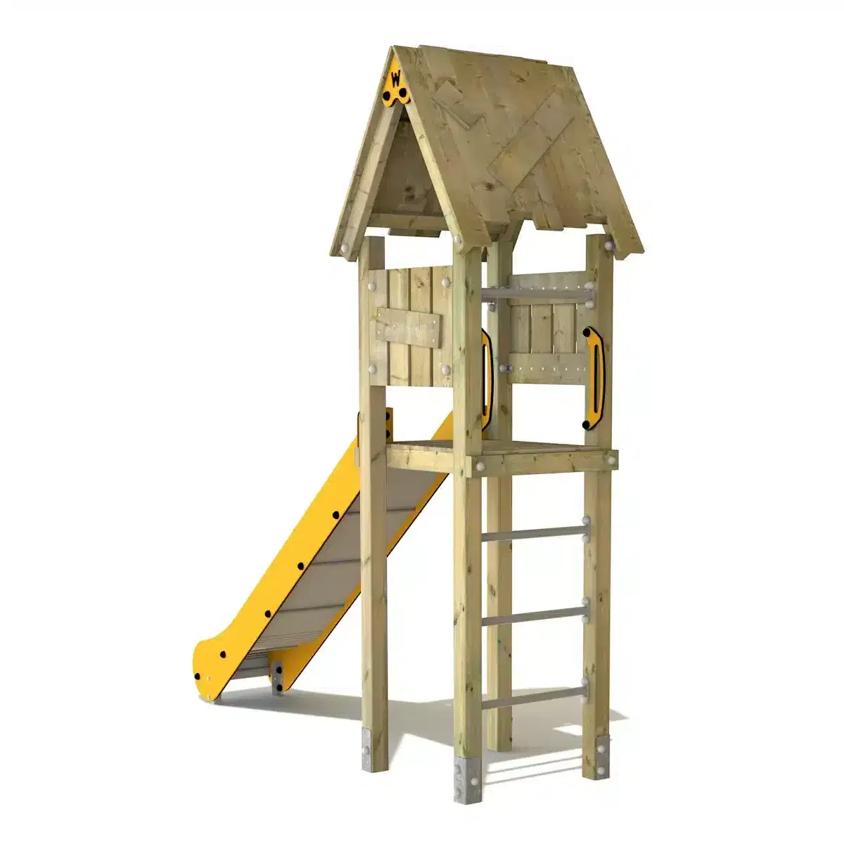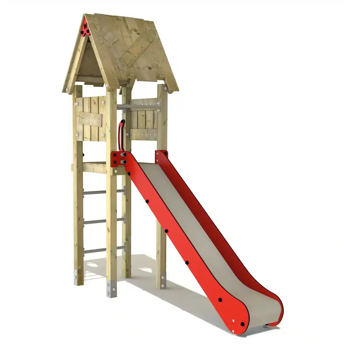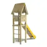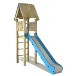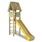 Zusätzlich besticht die Rutsche durch ein Holzdach und eine schräge Kletterleiter mit Edelstahlsprossen, die das Spielen noch spannender macht!