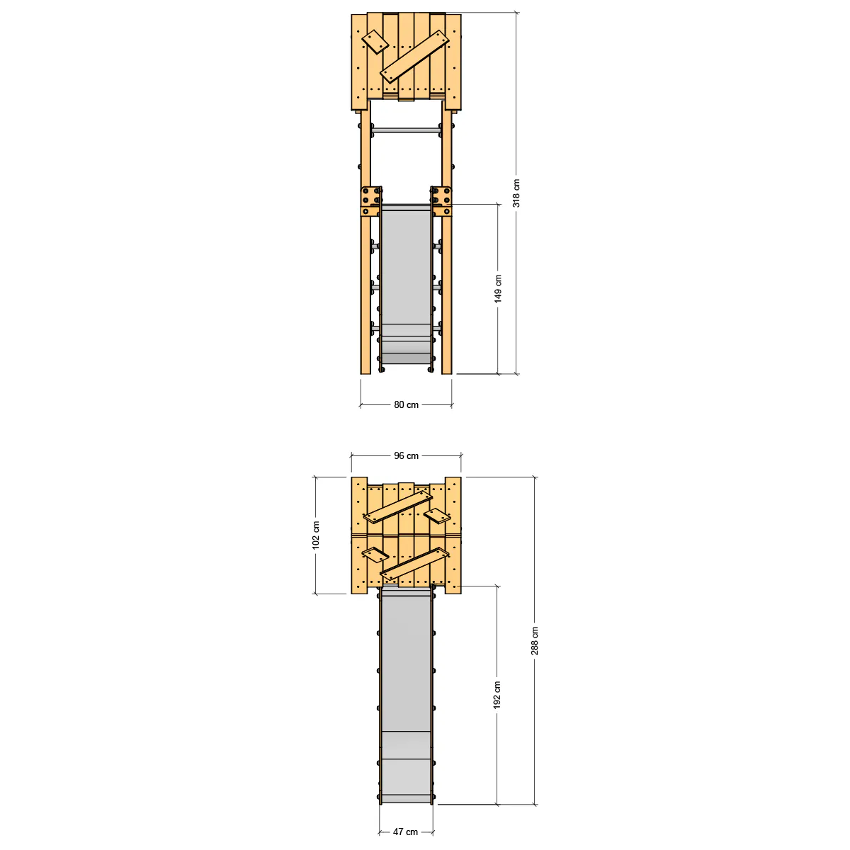 - Holzpaket, inklusive hochweriger HDPE-Rutsche mit stabilisierenden Edelstahlstreben