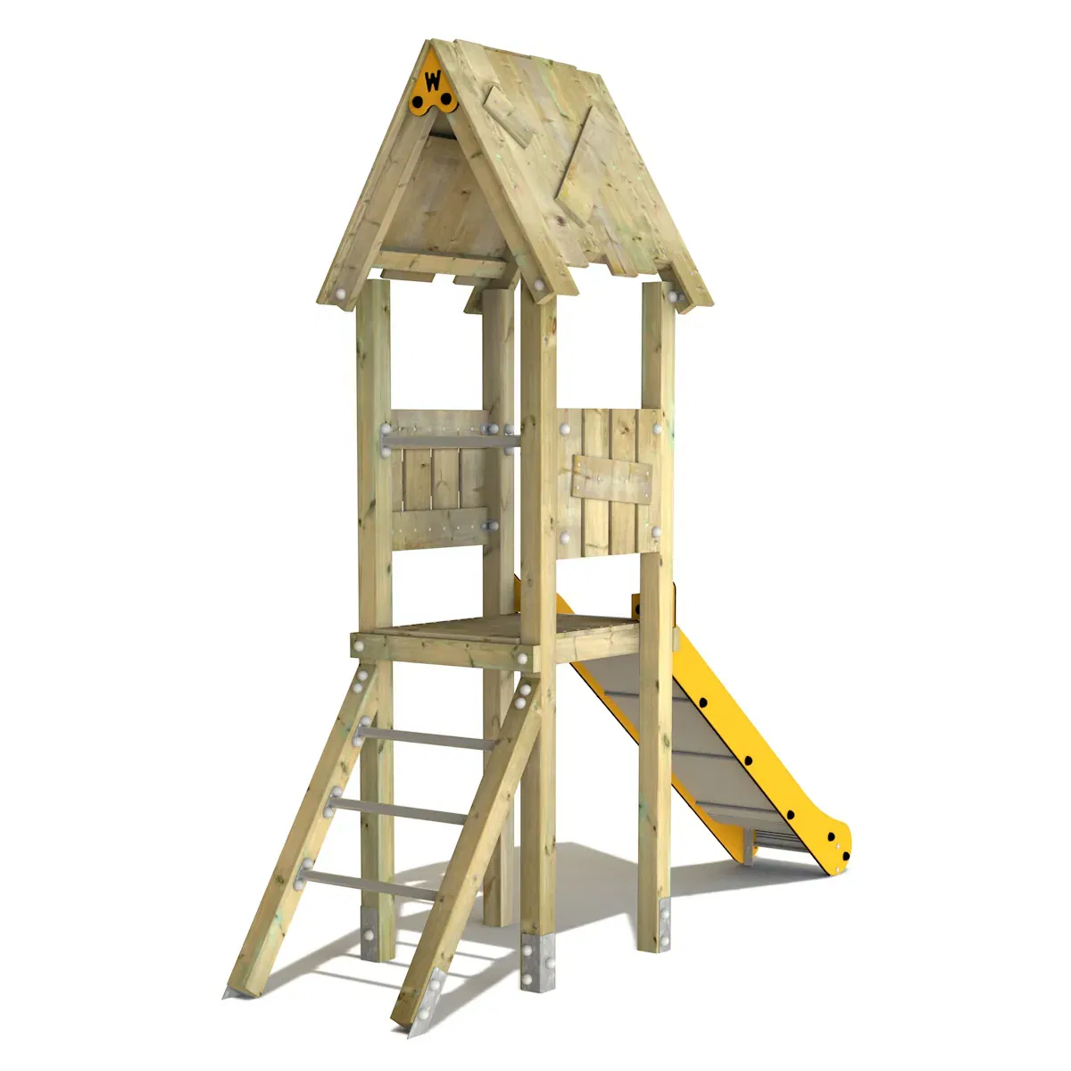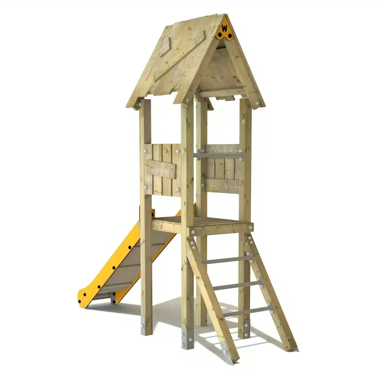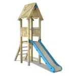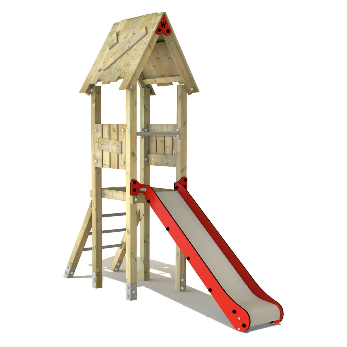 Zusätzlich besticht die Rutsche durch ein Holzdach und eine schräge Kletterleiter mit Edelstahlsprossen, die das Spielen noch spannender macht!