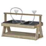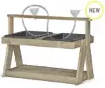 Diese freistehende Station verfügt über zwei großzügige, separate Wannen, die nach Belieben mit unterschiedlichen Materialien gefüllt werden können. Ein besonderes Highlight ist die neue, fest installierte Ablagefläche mit integriertem Schlauch und zwei Trichtern, die unzählige neue Spielimpulse setzt. Erhältlich in zwei kindgerechten Höhen – für Krippen- und Kindergartenkinder – und gefertigt aus erstklassigem, wetterfestem Rotholz, ist diese Station der perfekte, langlebige Mittelpunkt für kreatives und soziales Spiel im Freien.