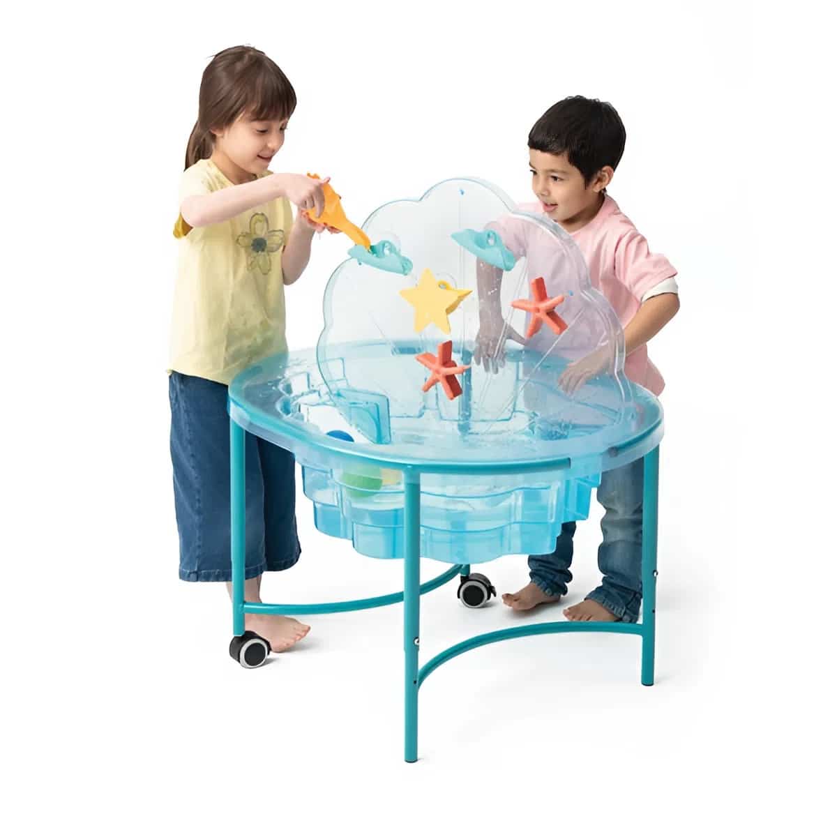 Das Besondere an diesem Spieltisch ist seine durchdachte Funktionalität. Der Deckel wird zur interaktiven Spielwand, an der die mitgelieferten Wasserspielzeuge befestigt werden können, während Trichter und Wasserräder faszinierende Einblicke in die Gesetze der Physik gewähren. Ob mit Wasser oder Sand gefüllt – diese Spielmuschel fördert das gemeinsame Spiel, die Kommunikation und die Feinmotorik auf eine fesselnde und kindgerechte Weise.